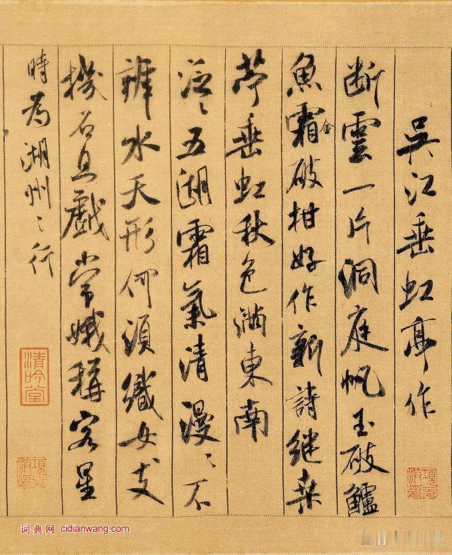 米芾(米海岳)写字,凡是向下写的笔画(竖),末尾都要先收再回锋;凡是向右或向左写的笔画(横、撇等),末尾也都要有回收的笔势。这八个字是书法中最高级的秘诀。 但写字还要注意字的整体结构和姿态。米芾自己说过,他早年是“集古字”,就是学习很多古代名家的结构,在这方面下了很大功夫。到了晚年,他才慢慢形成自己的风格。 学米芾书法的人,只有南宋的吴琚学得最像。其他如金代的王庭筠(号黄华)、元代的鲜于枢(号困学民,樗寮指其书斋),只学到一小部分。就连米芾的儿子米友仁(虎儿),也没能完全学像他父亲。