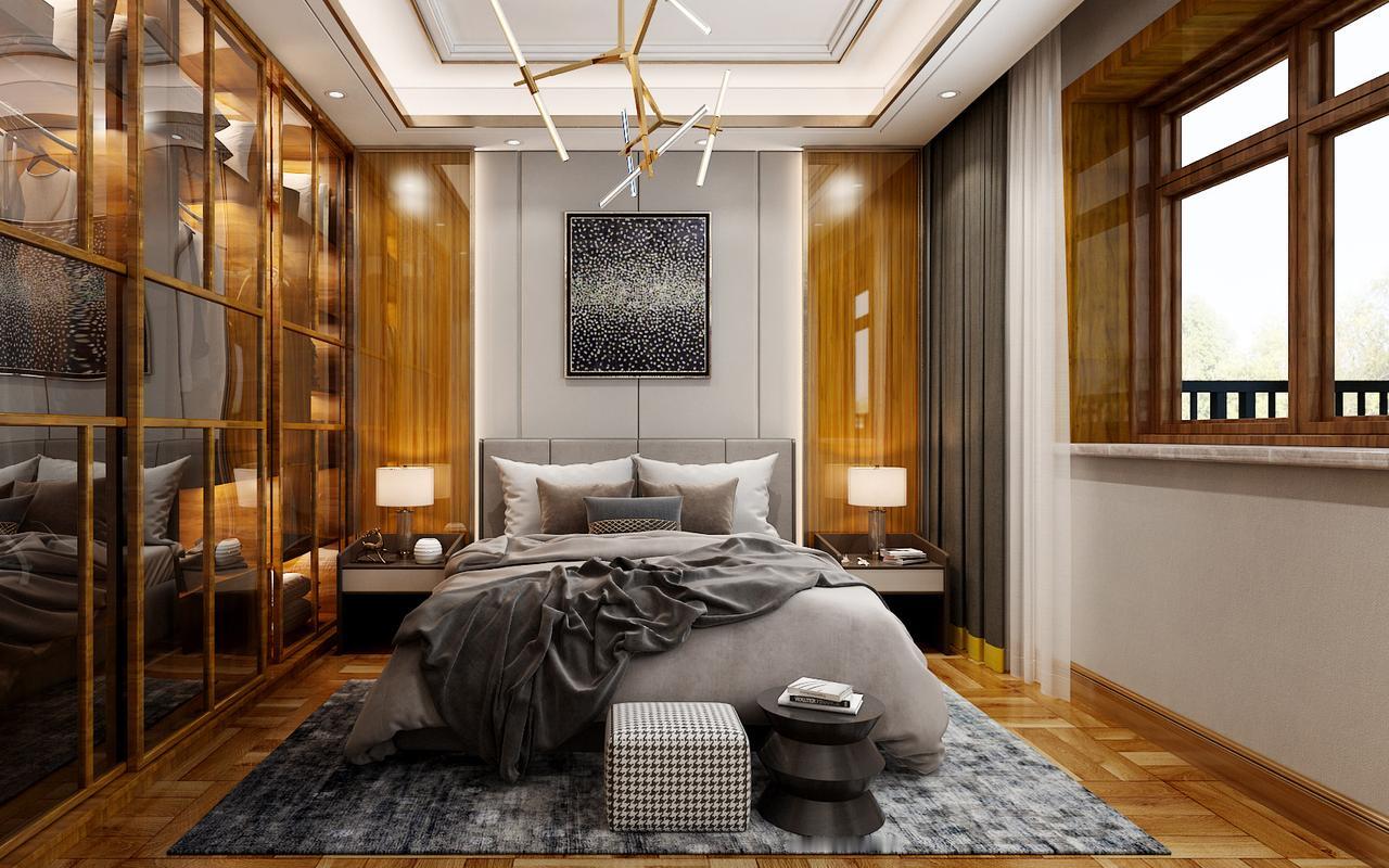 这间卧室的空间虽然不大,但设计师很好的规避了这一点,左侧是透明的玻璃柜门,柜子内部加装一些照明灯,在镜面反射的作用下,给人一种空间很大的即视感。相比传统的玻璃柜门来说,这种透明的不仅方便拿取衣物,而且节省了一部分费用。床头柜上面采用镜面木纹饰板,增加室内透光度的同时,也增加了空间感。