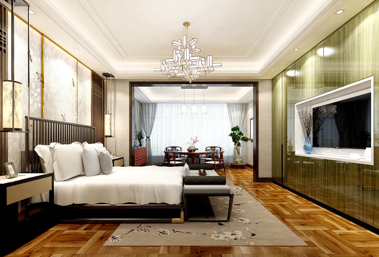 第二间卧室就是标准的新中式风格了,除了主要的休息区,还在侧边加了一个简易的会客区,方便屋主招待比较私密的朋友。毛毡地毯上映着梅花的图案,床头和灯罩上都有类似的花朵元素,让室内整体营造出一种清新淡雅的氛围。