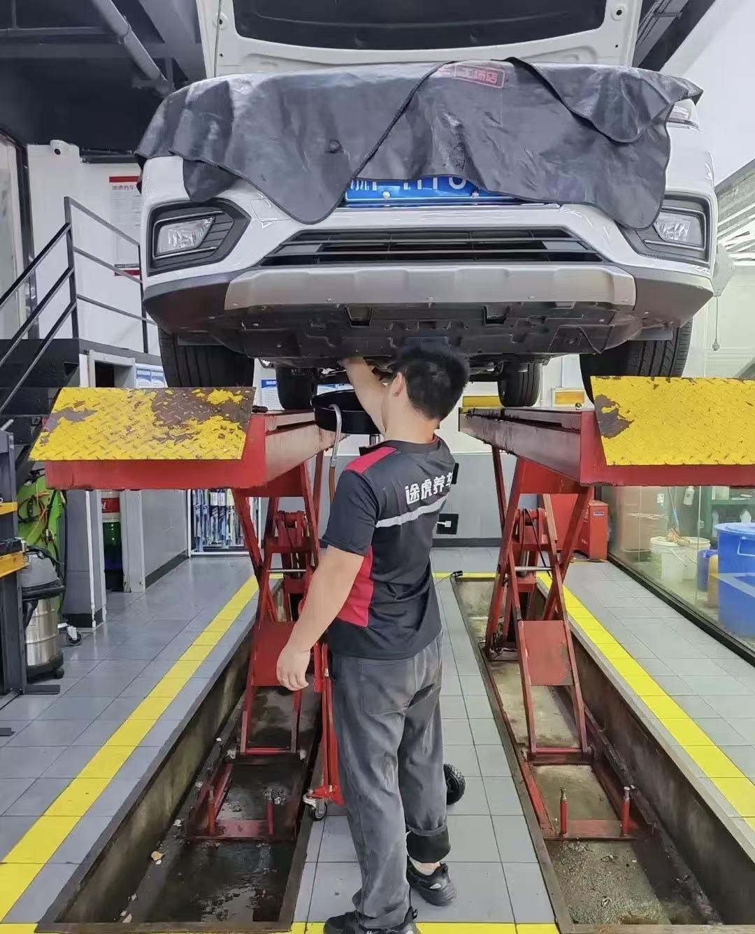 接下来就是全车的检查,包括了刹车油、防冻液、玻璃水这些,哪里不够就补哪里,如果含水率是达标的就不需要更换。师傅将我的胎压全部调整到2.3bar,还检查了轮胎的纹路、鼓包等问题,接着检查了我的底盘,发动机和变速箱也都没有漏油的情况,整体来看情况还是很好的。