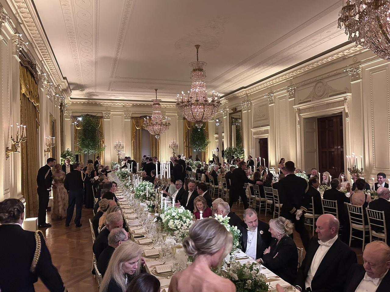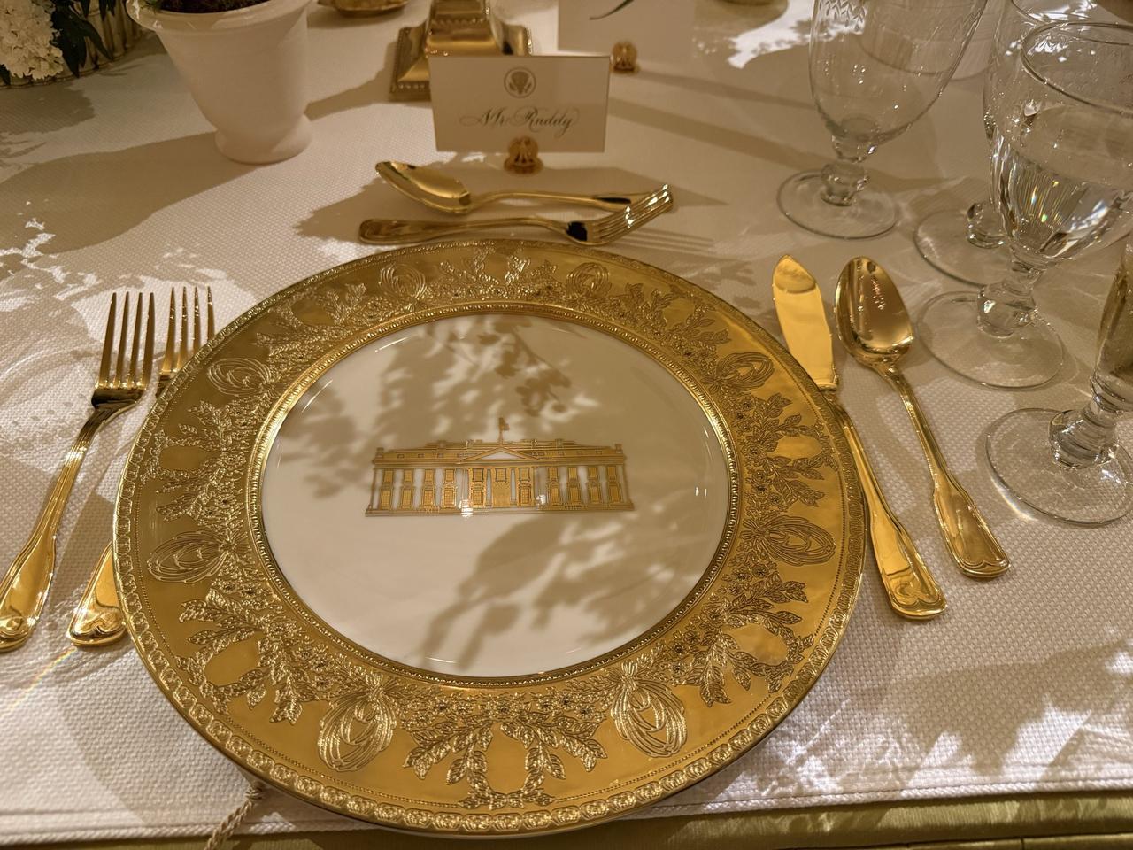 今晚的白宫,流光溢彩!特朗普总统以一场极尽奢华的国宴款待英国国王查尔斯。最吸引眼球的莫过于特朗普标志性的全套金色餐盘,在灯光下熠熠生辉,将宴会的“豪气”直接拉满!