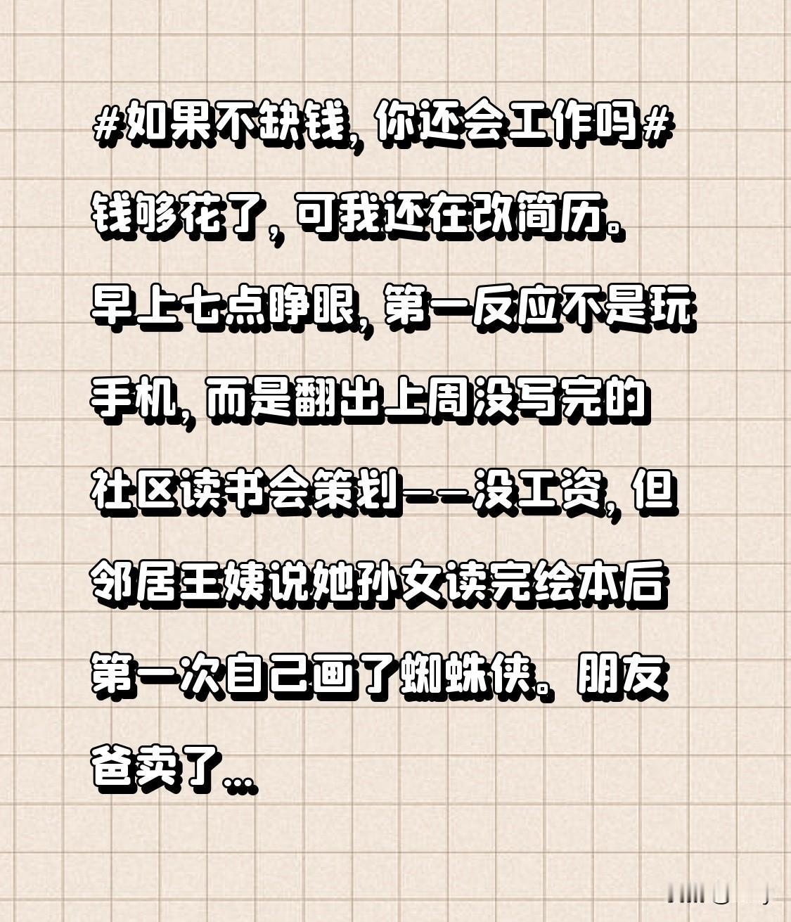 早上七点睁眼,第一反应不是玩手机,而是翻出上周没写完的社区读书会策划——没工资,但邻居王姨说她孙女读完绘本后第一次自己画了蜘蛛侠。