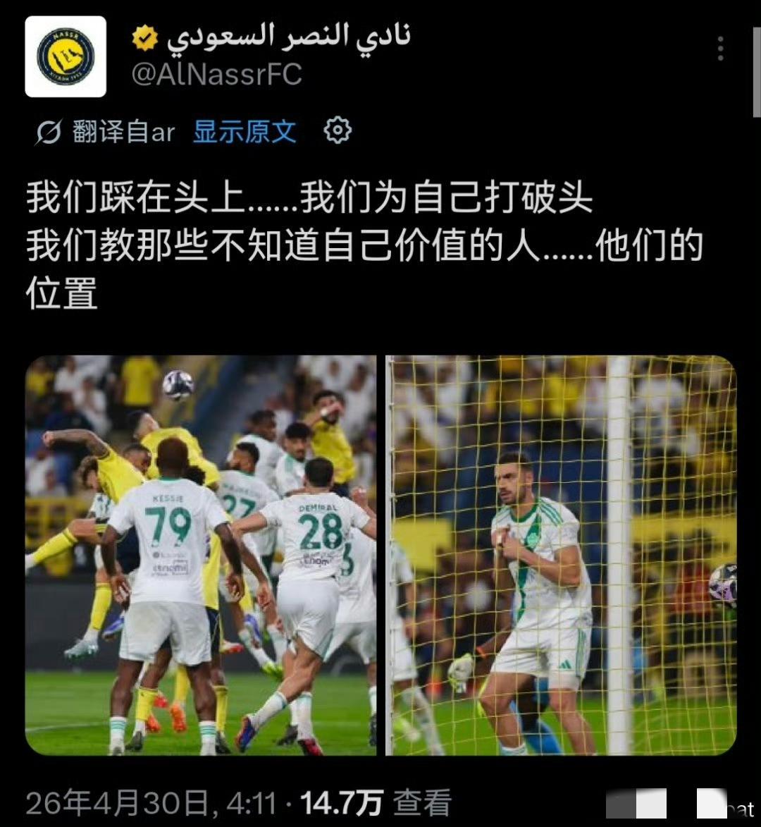 4、德米拉尔彻底失智,比完两根手指后,又晒出亚冠奖牌。利雅得胜利官推直接开大嘲讽德米拉尔: