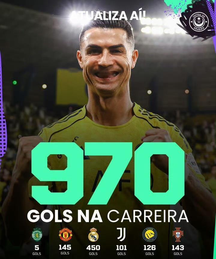 2、这也是C罗最骄傲的地方,进球数来到970。可是他所花的比赛场数远超梅西。