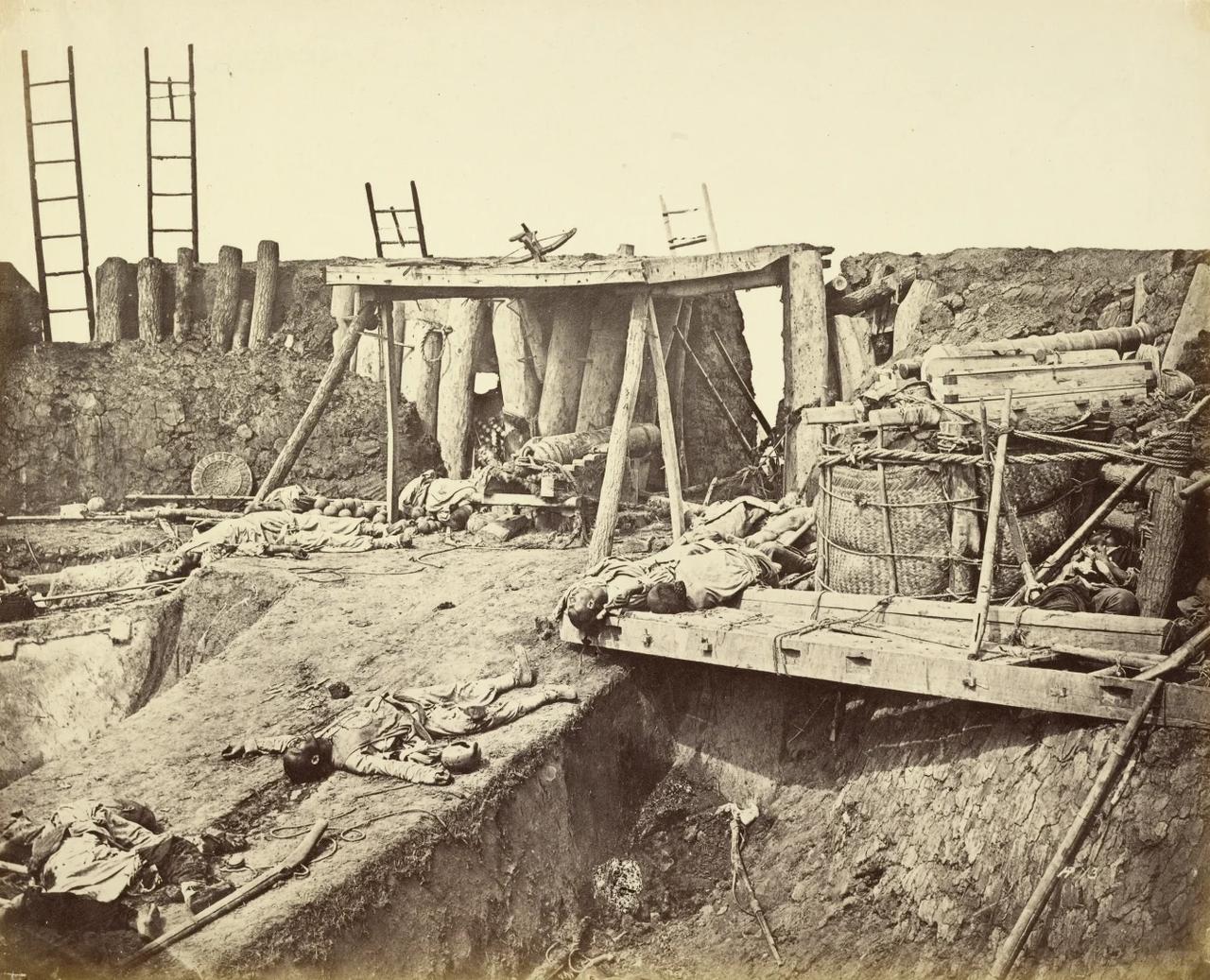 1860年的大沽口炮台,大沽口炮台工事已被炮火摧毁,木质支架、土筑城垣破损不堪,横陈着是清军阵亡士兵的遗体,这些士兵是在炮台失守的最后时刻战死的,遗体还留在阵地上,没有来得及被收殓。