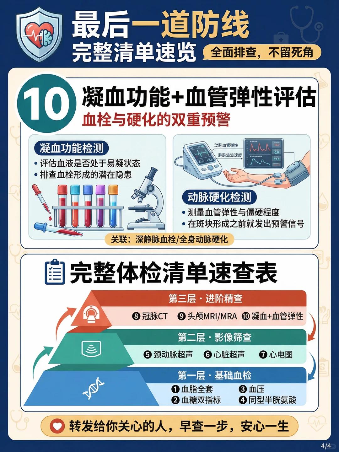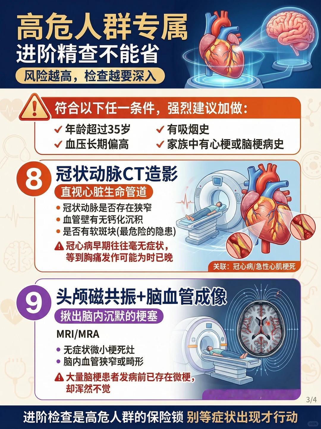 第三层:高危人群进阶精查~ 年龄>35岁、吸烟、高血压或有家族病史者,建议加做冠脉CT、头颅MRI/MRA及凝血功能与血管弹性评估,在斑块和血栓形成前完成预警。