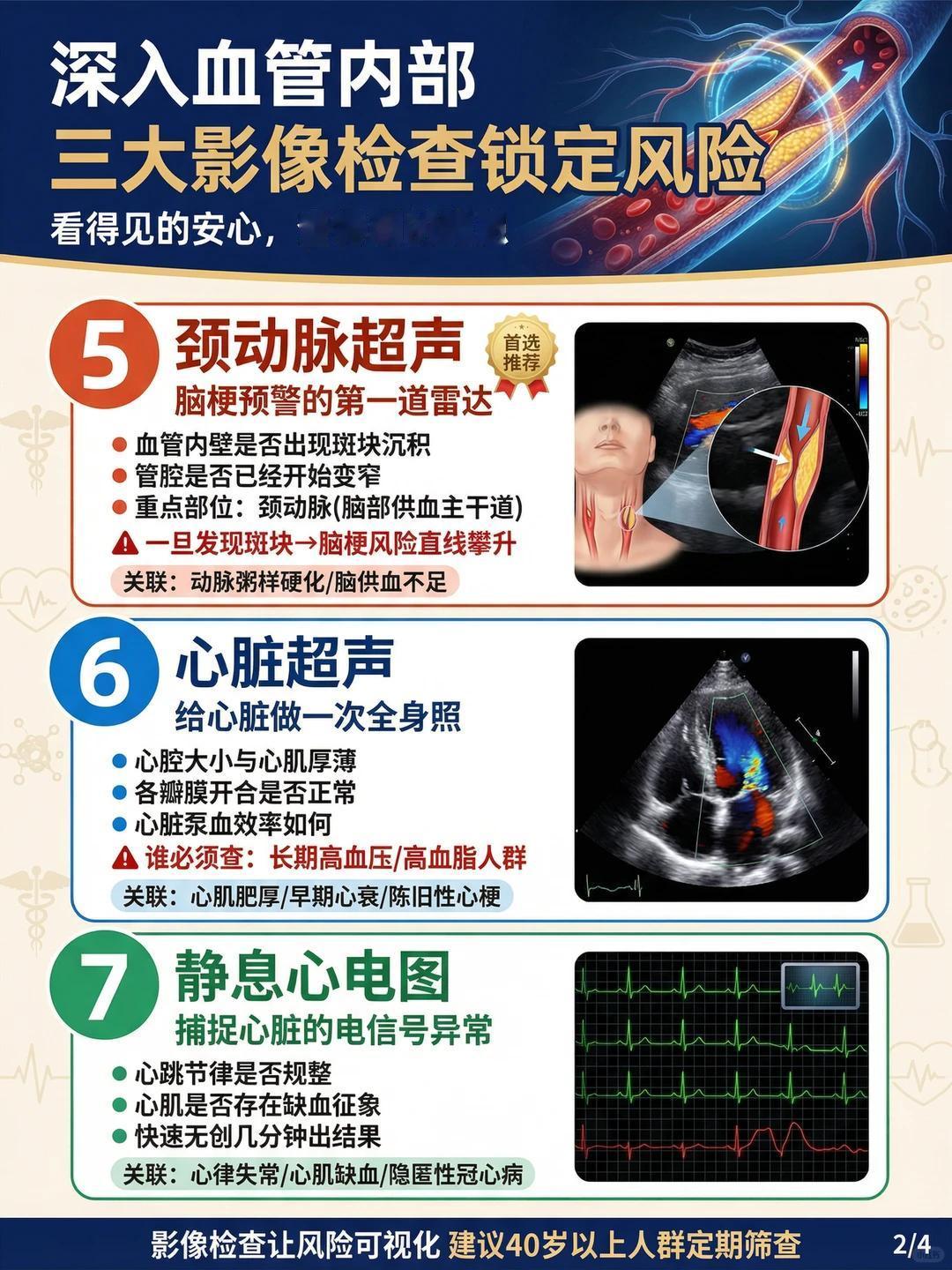 第二层:三大影像筛查~ 让隐患无处遁形。通过颈动脉超声排查斑块,心脏超声评估结构功能,静息心电图捕捉电信号异常,实现风险可视化。