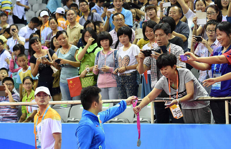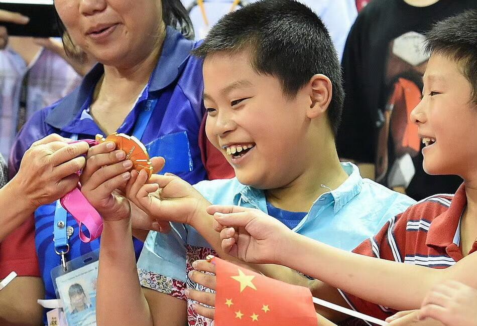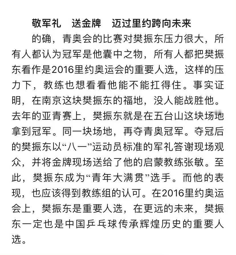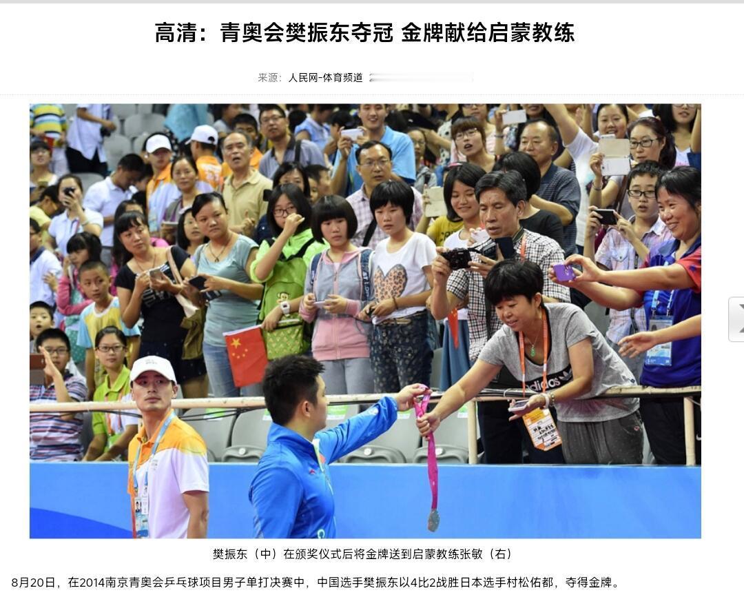 在2014年17岁的樊振东达成了人生第一个大满贯“青年大满贯”敬军礼为国争光,递金牌感恩启蒙恩师。樊振东荣誉加身时,他始终不忘来路,在颁奖仪式后主动将金牌递到启蒙教练张敏手中。最后三位小娃娃太演我了。
