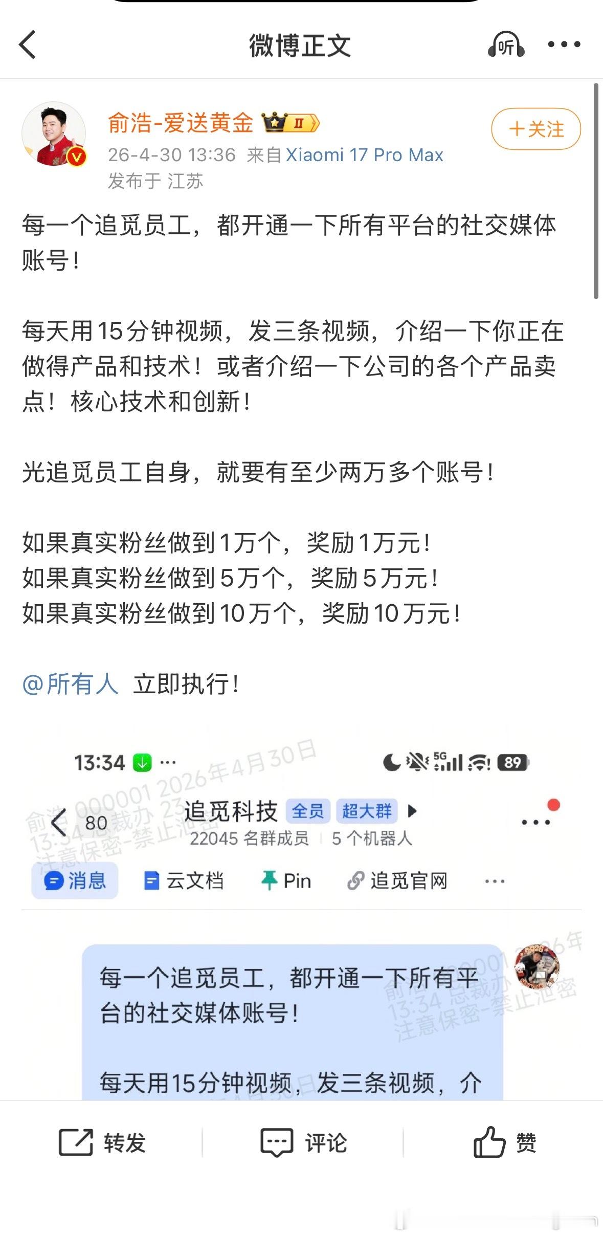 【追觅俞浩要求员工开通社媒账号追觅俞浩要求员工每天发3条视频】4月30日,追觅科技创始人兼CEO俞浩发文:“每一个追觅员工,都开通一下所有平台的社交媒体账号!