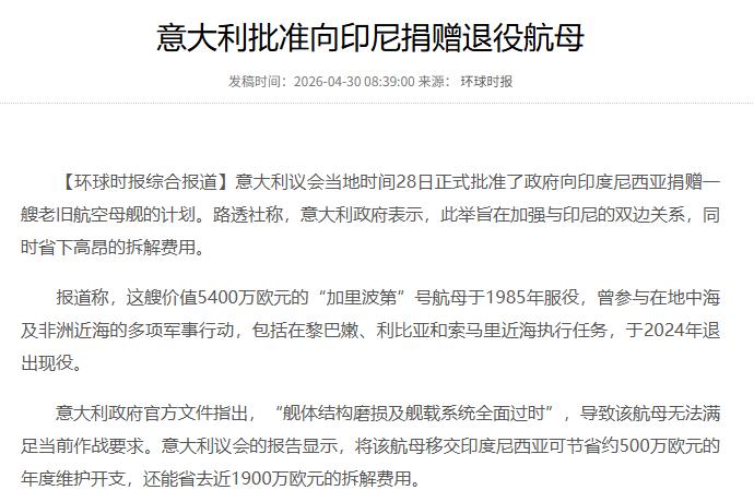 4月28日意大利议会正式拍板,把服役40年的退役航母白送给印尼!全网都在喊印尼捡了天大的便宜,可没人戳破这层窗户纸:这场看似大方的无偿捐赠,从头到尾都是一笔算到骨子里的生意!