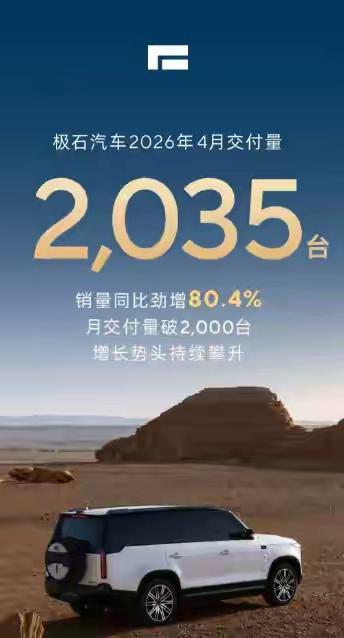 4月,极石全球交付2035台新车,同比增长80.4%,这是极石汽车城里以来首次月交付量突破2000台关口。