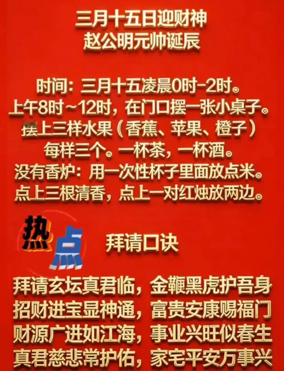 三月十五迎财神0时~2时(赵公明元帅诞辰)。