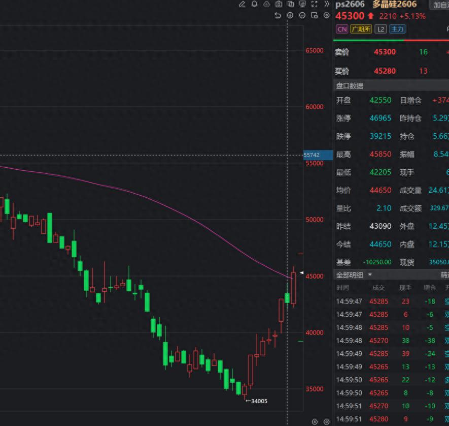 今天广期所多晶硅 2606 合约单日暴涨 5.13%,价格直接冲至 45300,从低点 34005 一路强势反弹,走出连续大阳线的反转行情。