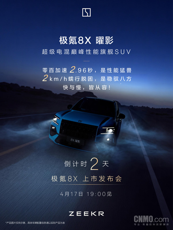 【CNMO科技消息】4月15日,距离极氪8X上市发布会(4月17日19:00)还有2天,该车将提供甄选车辆,上市即可交付。