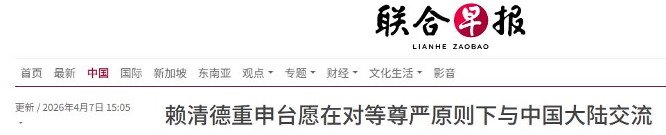 据《联合早报》消息称,赖清德在郑丽文抵达大陆的当天,出席郑南榕去世37周年的活动期间,重申了一个观点,“台湾愿意在对等、尊严原则下,与中国大陆进行交流合作”。