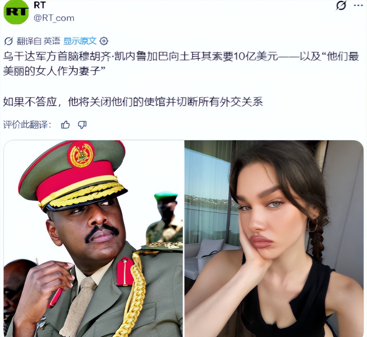 乌干达武装部队司令穆胡齐·凯恩鲁加巴向土耳其提出了两项要求:第一项要求是,鉴于乌干达长期以来在索马里打击武装分子的军事贡献,土耳其应支付10亿美元;第二项要求(极有可能是开玩笑)是交出“土耳其最美丽的女人”,凯恩鲁加巴说她会成为他的妻子。