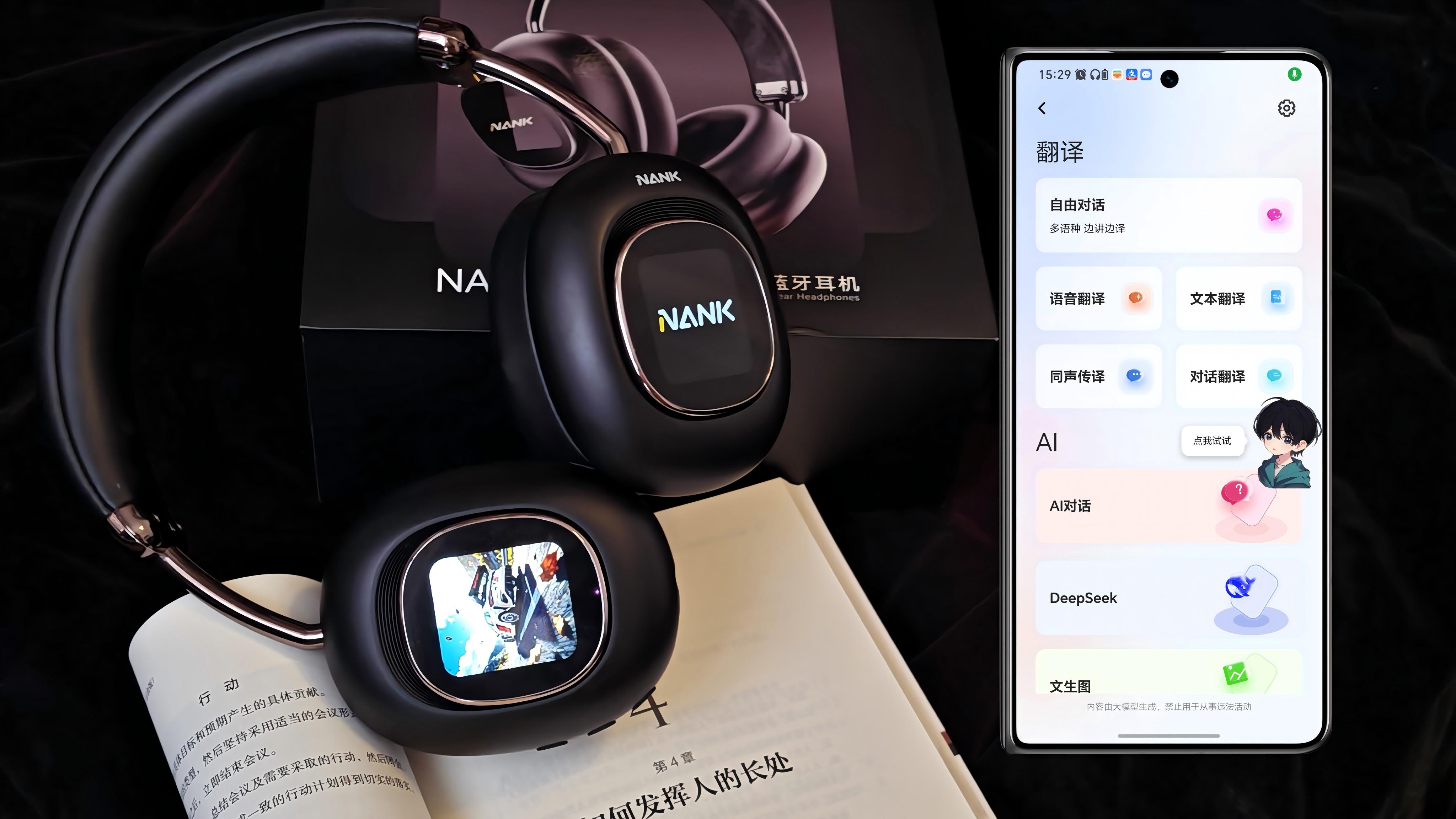 耳机集合DeepSeek 全模加持,实现多模态 AI 能力全面整合,覆盖同声传译、对话翻译、文本翻译、助手、文生图内容创作全场景。出国出差碰到语言不通,看剧想要翻译时,实时翻译功能秒响应,对话几乎无延迟;写稿卡壳时,唤醒 AI 助手就能获取灵感;既是耳机,又是你的智能随身助手。