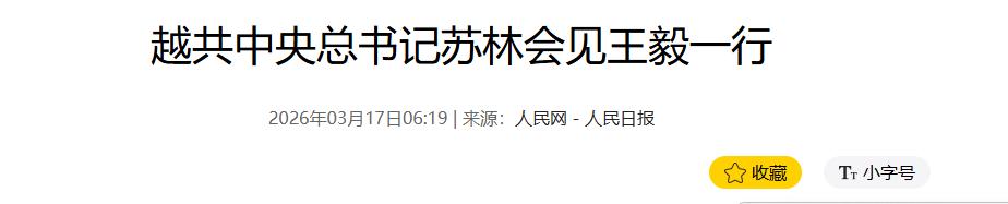 人民网:越共中央总书记苏林会见王毅一行,2026-03-17