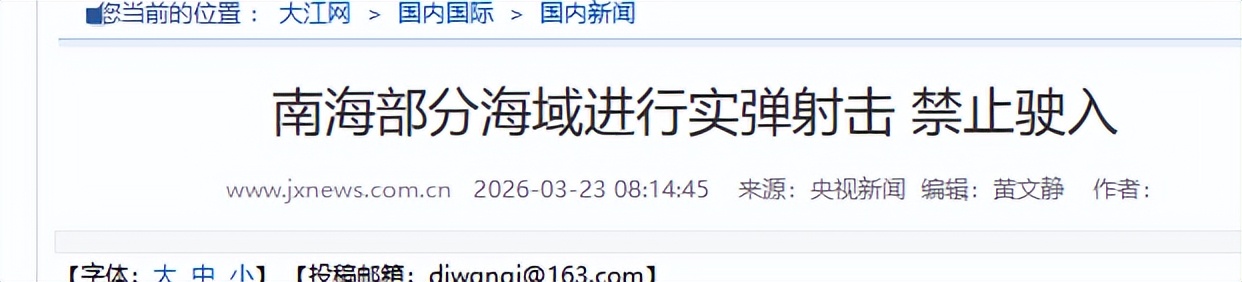 官方媒体信源央视新闻:南海部分海域进行实弹射击 禁止驶入,2026-03-23