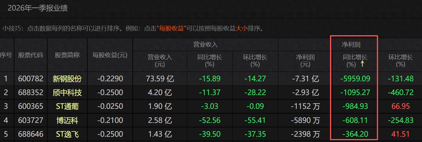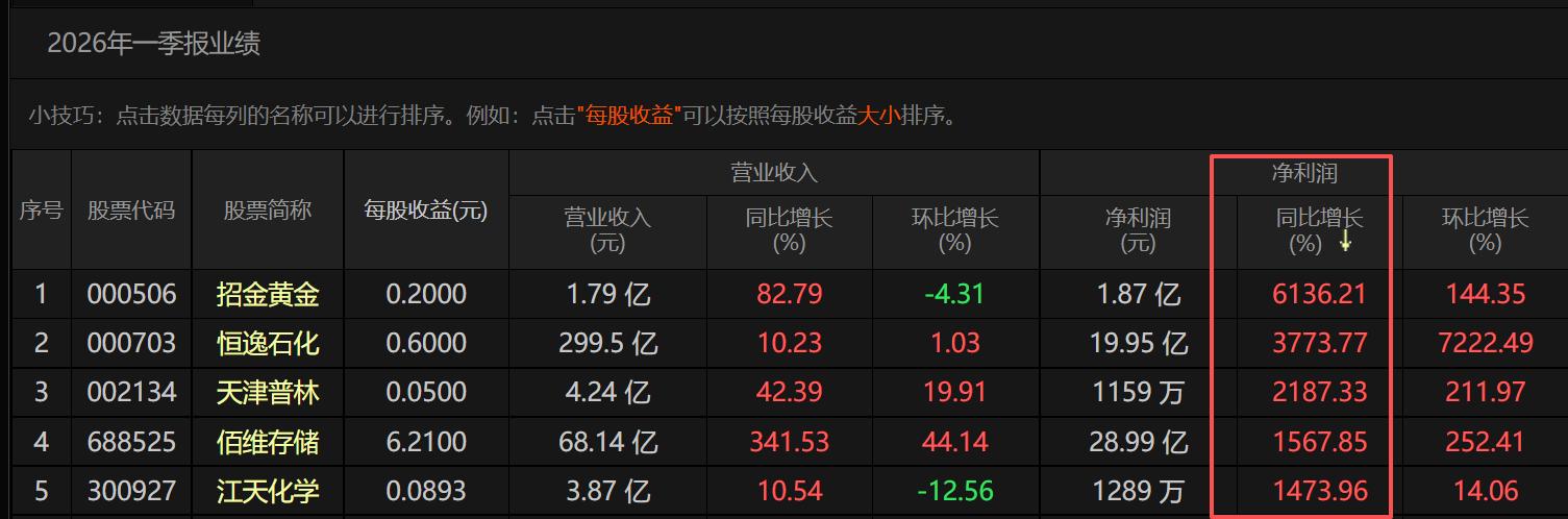 三、背后行业与周期底层逻辑1. 亏损集体暴雷的共性原因强周期传统行业承压:钢铁(普钢)、油服工程处于行业下行周期,原材料成本高企、下游需求不足,量价齐跌直接吞噬利润。部分赛道景气度拐点下行:半导体细分、传统电商、自动化设备,进入行业去库存、订单收缩阶段,营收利润双双滑坡。ST 标的经营风险:2 只 ST 股本身基本面孱弱,持续保壳压力大,仅短期环比略有修复,长期不确定性极高。2. 盈利集体爆发的核心驱动贵金属超级行情:招金黄金受益全球金价持续历史新高,量价齐升带来利润爆炸式增长。半导体周期反转:佰维存储、天津普林,直接受益 AI 算力、存储芯片行业大周期回暖,行业景气度触底反弹,订单、营收、利润全面爆发。炼化化工周期修复:恒逸石化、江天化学,化工炼化周期触底上行,产品价差扩大,盈利迎来拐点式反弹。四、交易与风控实战启示增速陷阱⚠️:超高同比增速≠长期优质。高增组的暴增,很多是去年同期极低基数带来的,持续性需要打问号,不可盲目追高。亏损股避雷:一季报大额亏损、营收持续双降的标的,短期趋势极难反转,下跌风险远大于机会,普通交易者尽量规避。行业分化极致:同一个大板块(半导体),内部出现 “巨亏” 和 “爆赚” 的极端分化,选股必须细分赛道 + 公司竞争力双重筛选,不能只看板块标签。现金流优先级:相比纸面利润,每股经营现金流更值得关注:亏损组多数现金流为负,盈利组现金流分化,长期安全边际差距巨大。五、关键风险提示本解读仅基于一季报静态数据,不构成任何投资建议。股市周期波动极强,短期业绩爆发不代表全年持续,业绩亏损也存在边际反转可能,交易务必做好仓位管理与止损纪律。