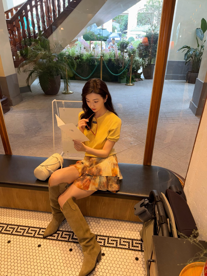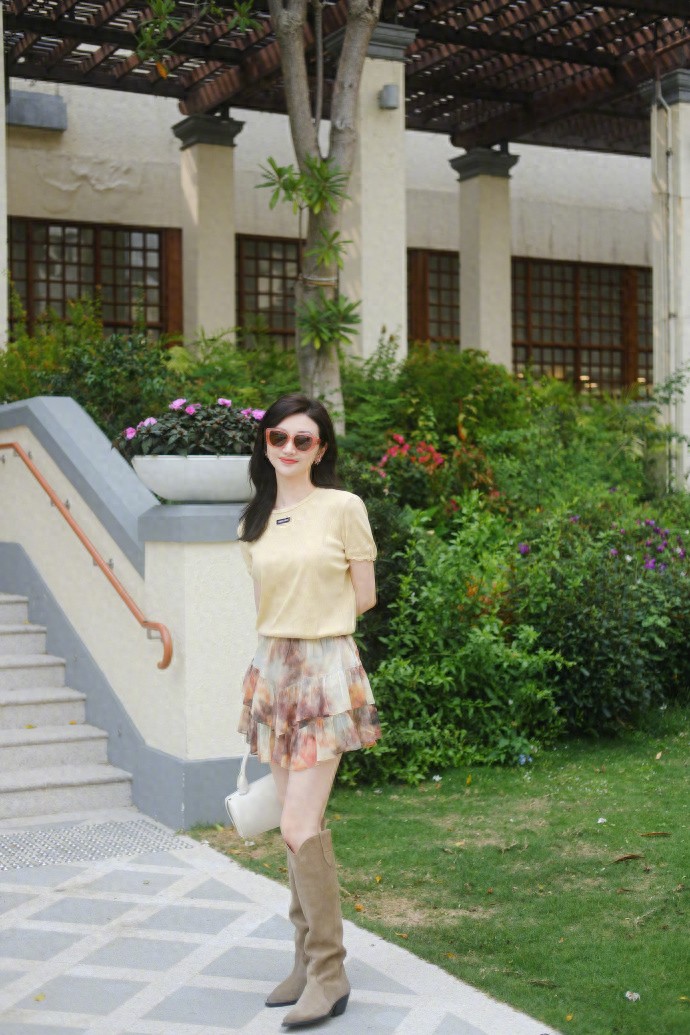 景甜脚踩长筒靴配小短裙美拍,甜到心里了,温柔可爱