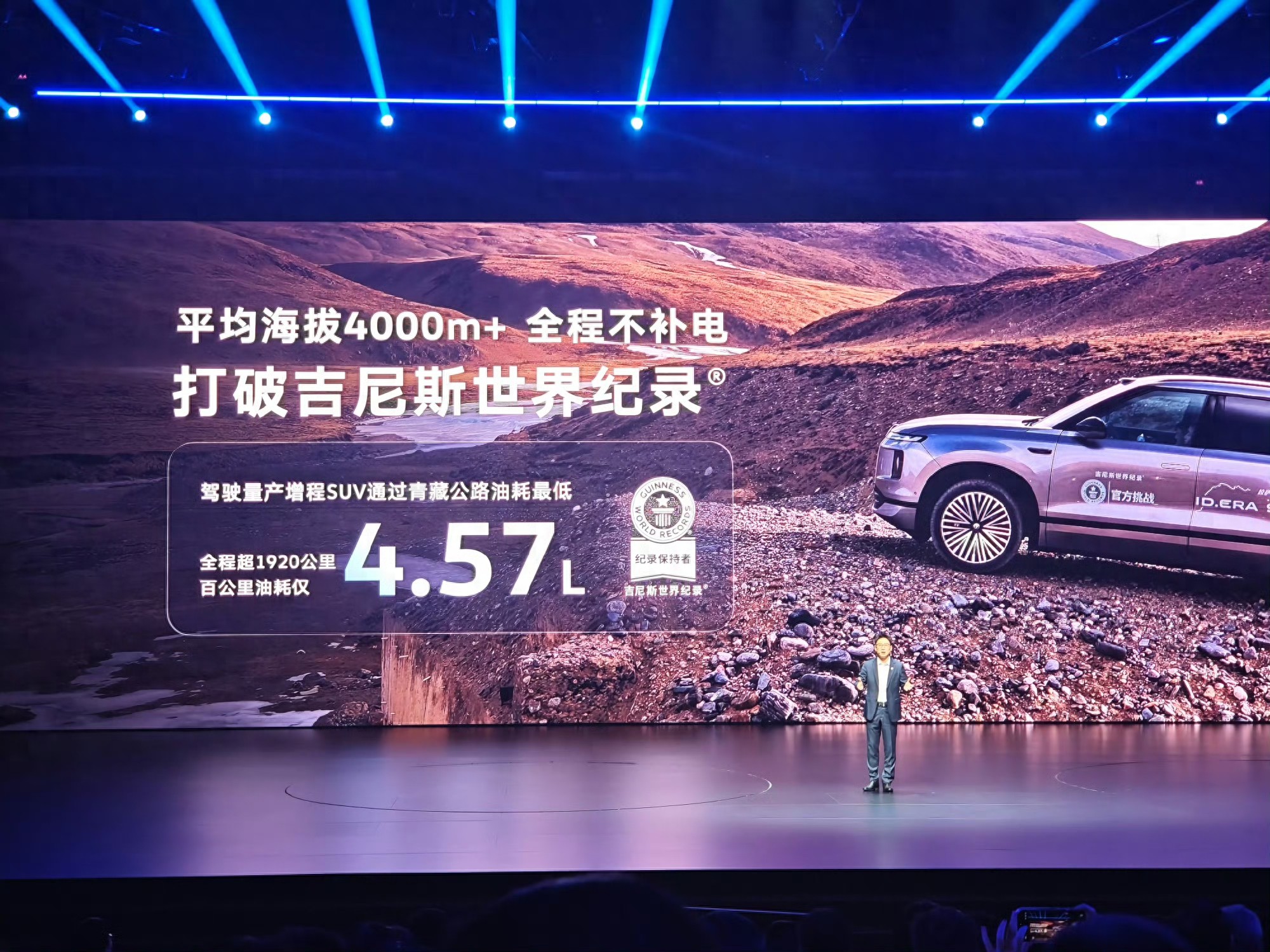 ID.ERA 9X在穿越青藏公路(总长约1920公里,最高海拔5200米)的实测中,以亏电状态跑出百公里4.57L的综合油耗。该结果由吉尼斯世界纪录官方认证为“量产增程SUV高原最低油耗”纪录。