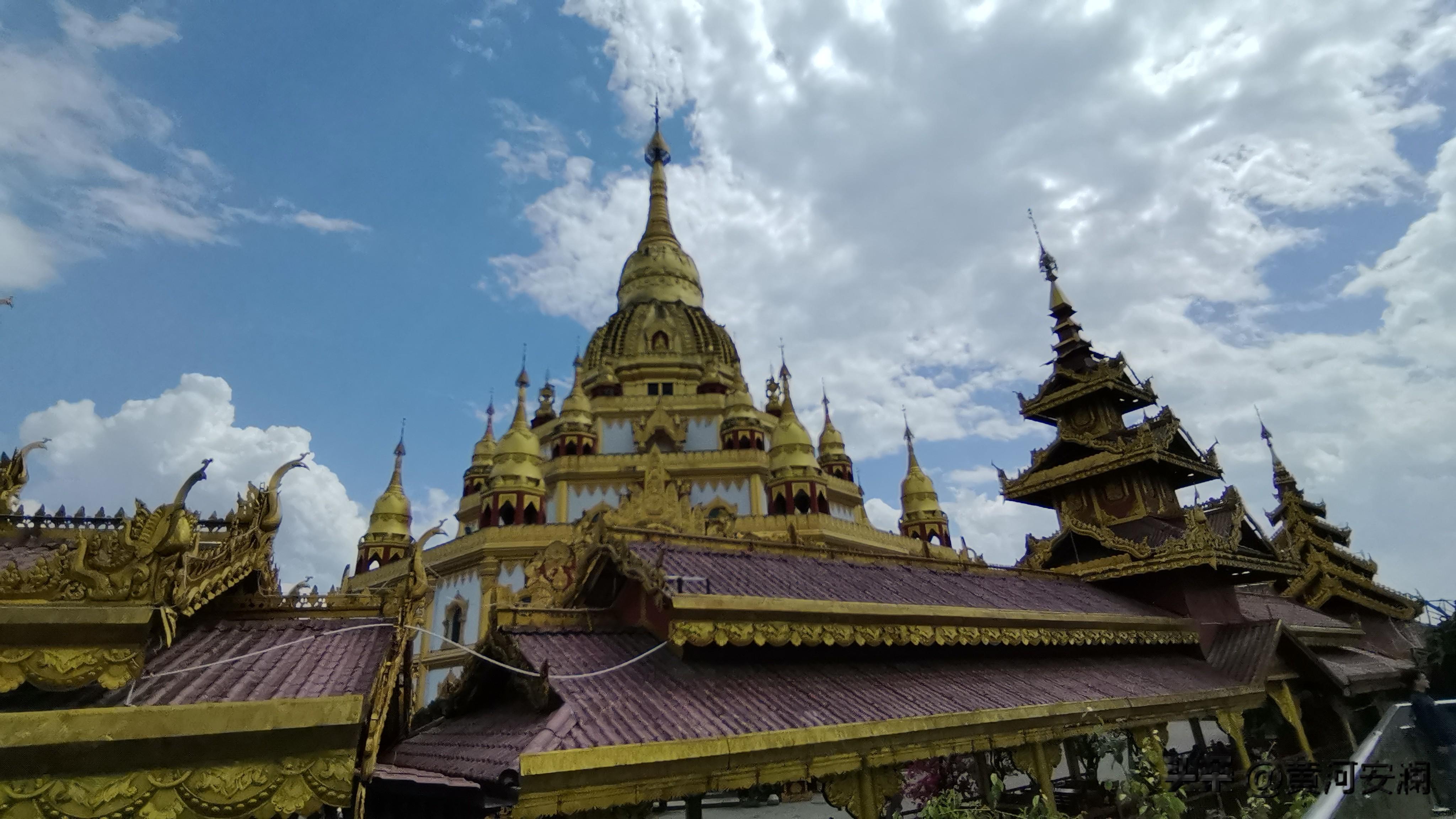 我第一次走近大金塔的时候,真的被震撼到了。沿着台阶往上走,两侧是蜿蜒的金色巨龙,各有五个龙头昂首挺立,那金色在阳光下熠熠生辉,仿佛镶嵌了宝石一般。塔身主体是铜钟状的,从下往上看,一层至四层是露天平顶,各建了6座小塔,共24座,形成众星捧月般的塔林;五层形状像金钵倒扣;六层就是那座钟型大塔;七层是逐渐缩小的瓶颈造型,最顶上戴着一个重达2.3吨的大金顶。