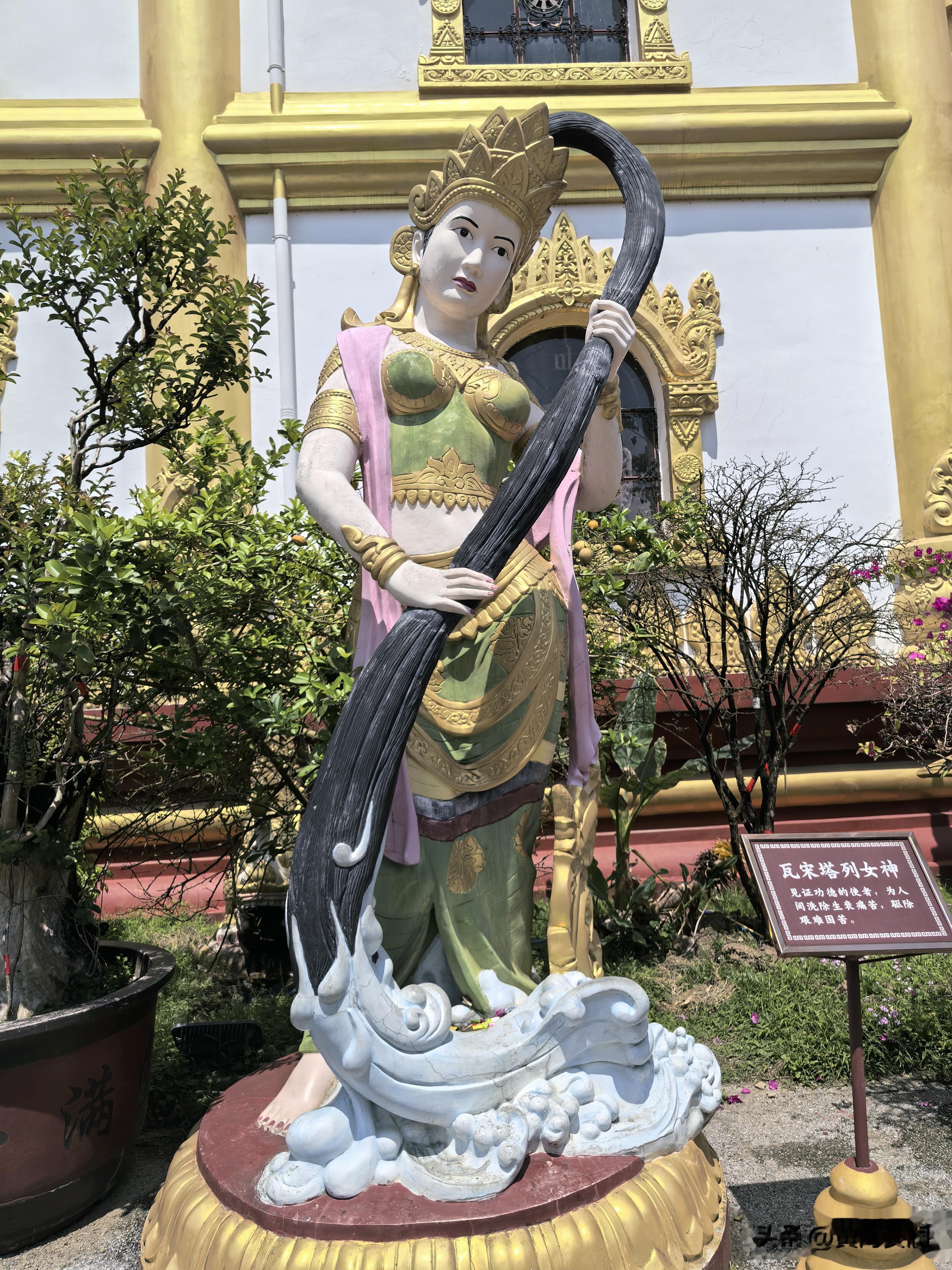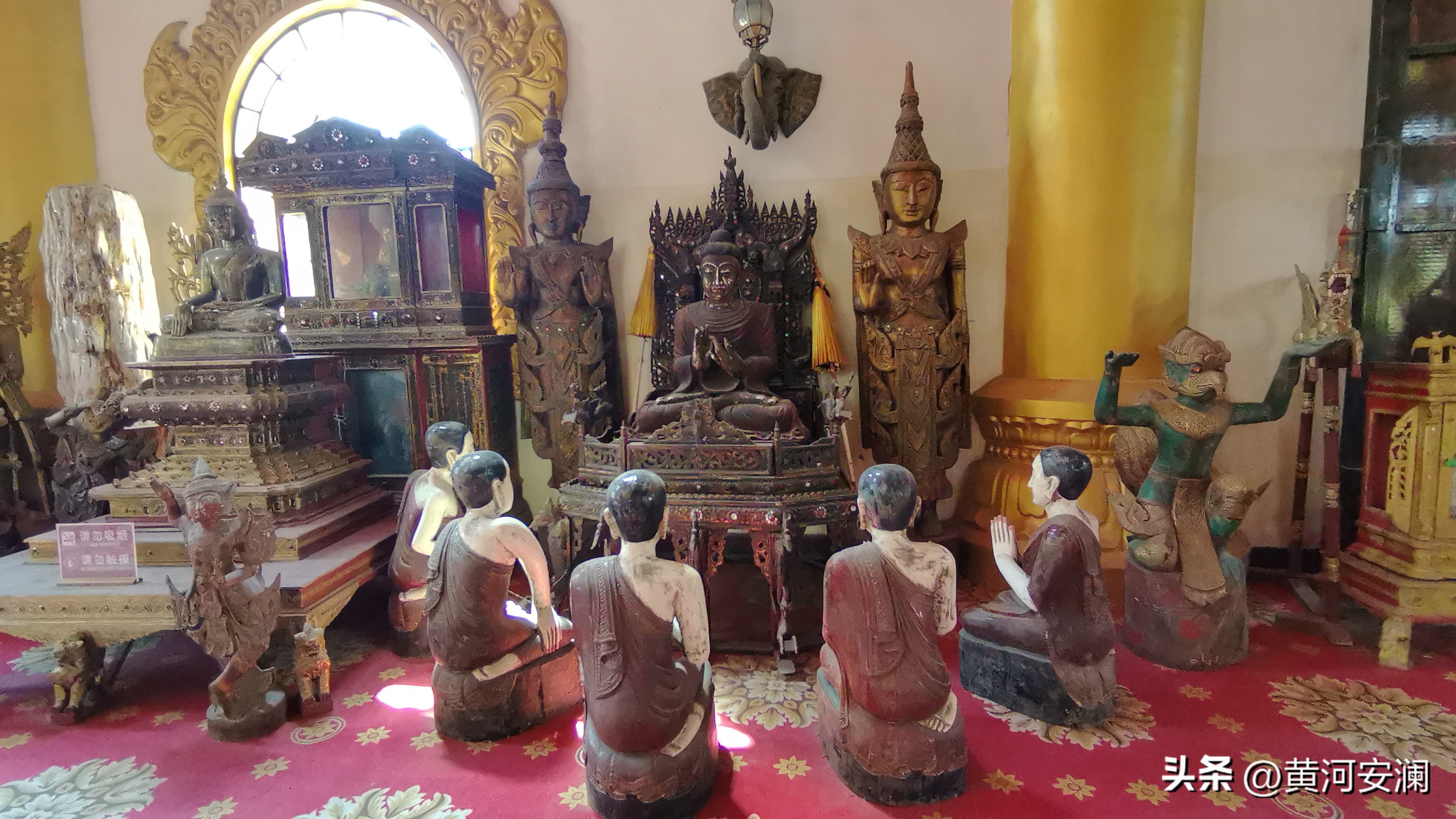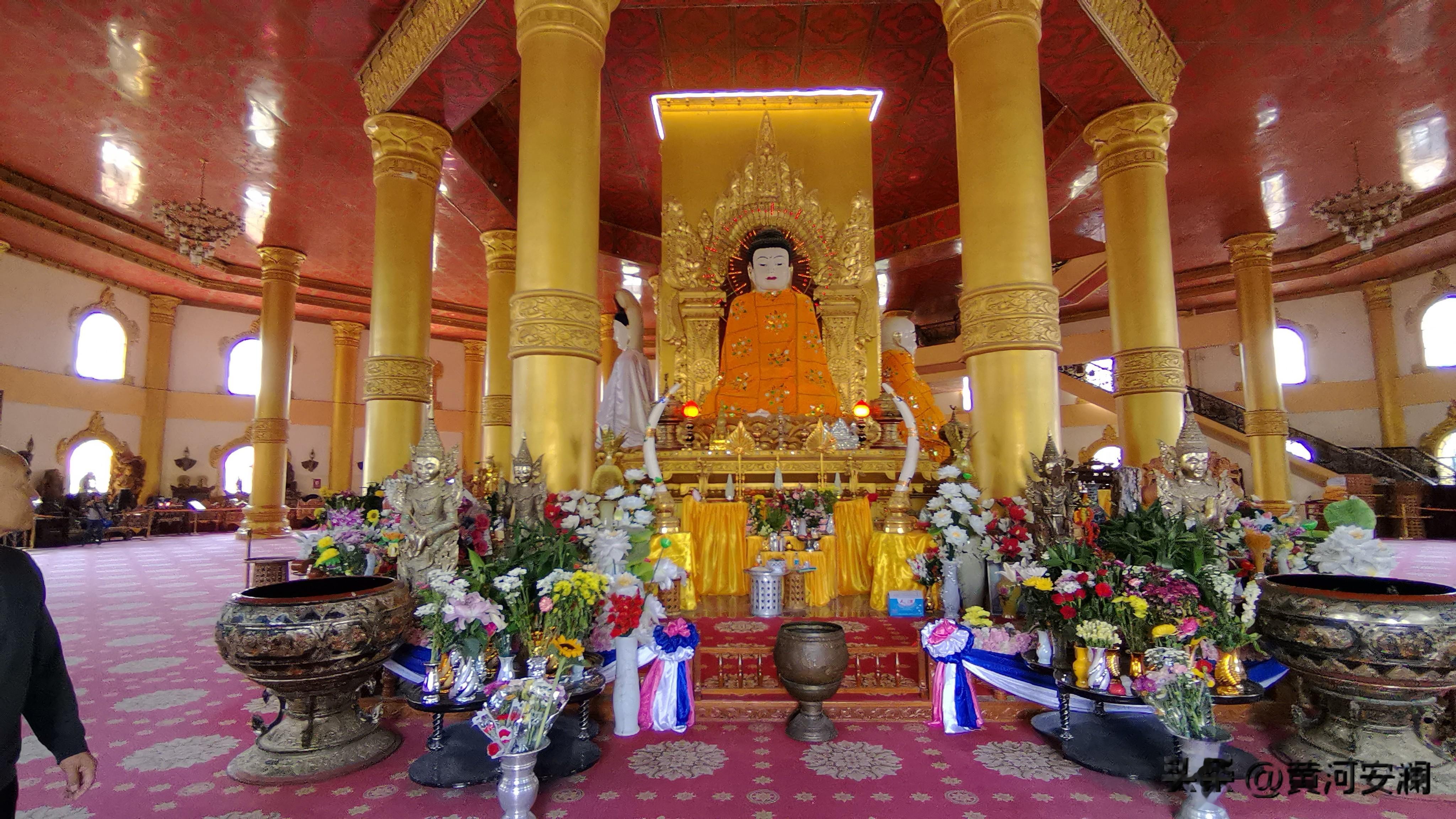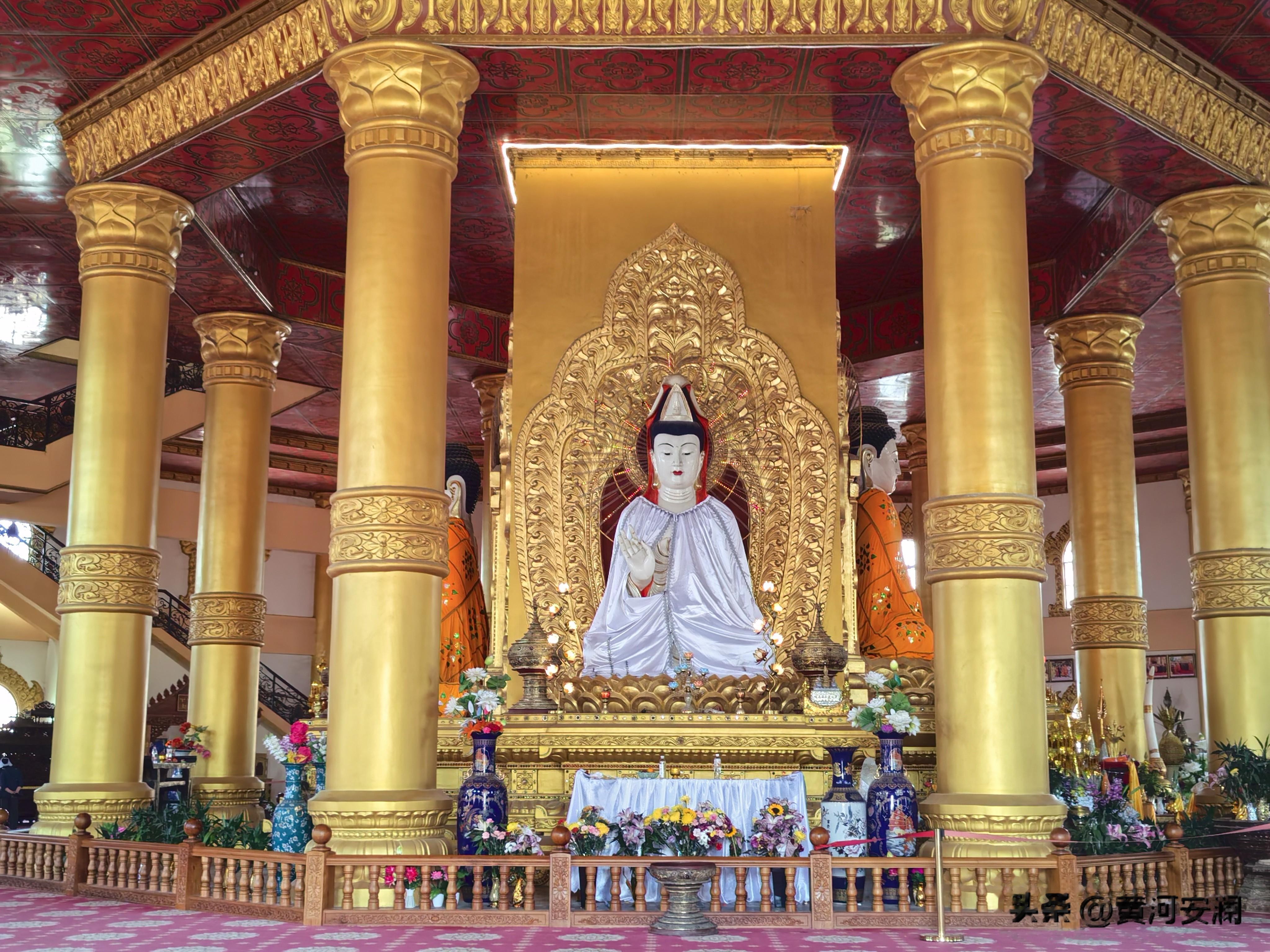 最让我惊喜的是,这座塔是空心的!第一层大殿面积就有2000平方米,可以同时容纳2000多人。走进去一看,金碧辉煌,气势磅礡,中心方柱东西南北塑有4座佛像。第二、三层外平台还建有16座造型别致的群塔,塔亭内有16尊汉白玉佛像。站在塔内的观景台上,整个芒市坝尽收眼底——傣家村寨如诗如画,城区繁华初现,傍晚时分还能看到勐焕银塔在远处与之交相辉映。