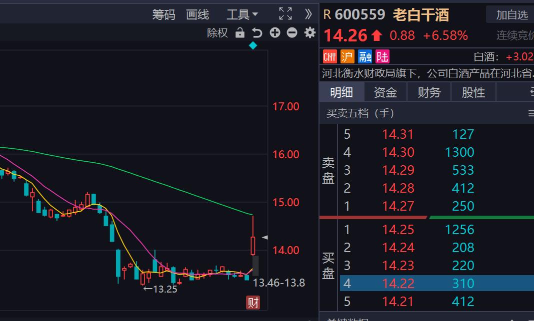 2. 老白干酒当日涨幅:+6.73%,现价 14.28 元