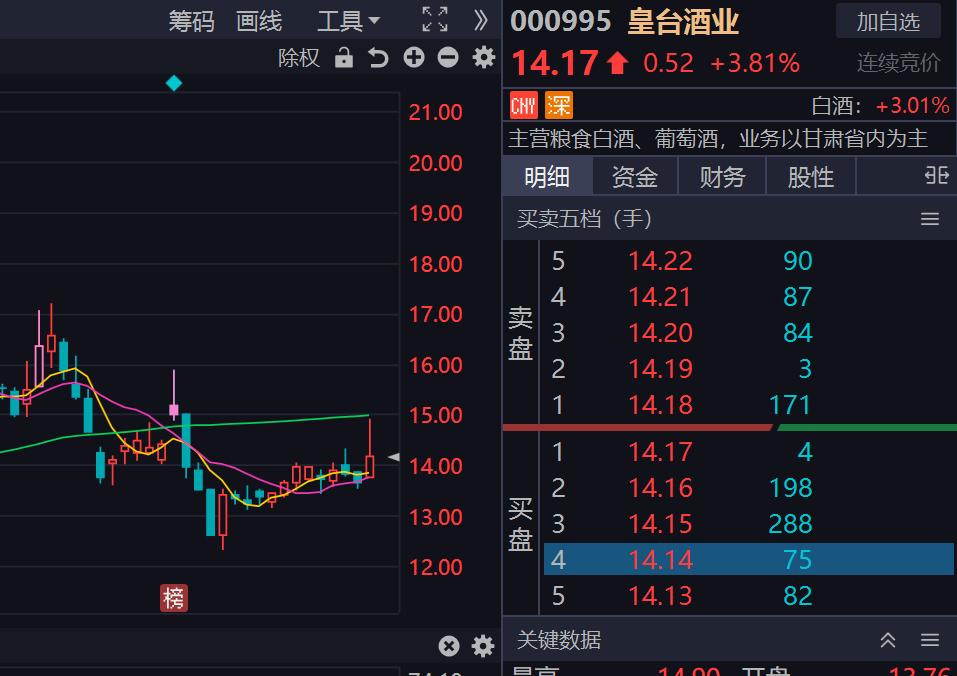 6. 皇台酒业当日涨幅:+3.96%,现价 14.19 元