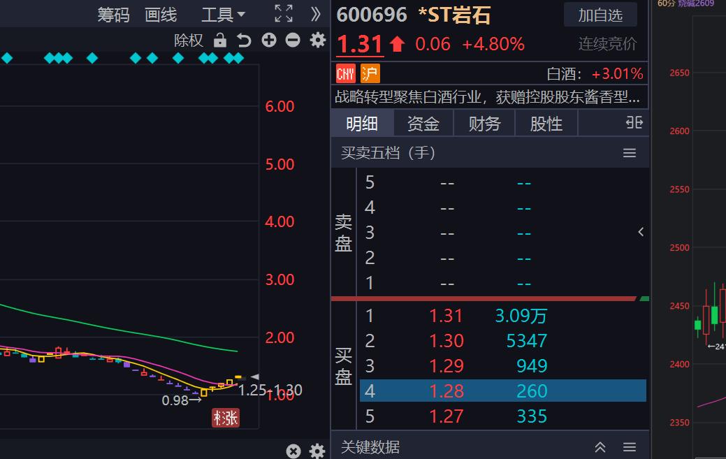 3. *ST 岩石当日涨幅:+4.80%,现价 1.31 元公司定位:转型白酒销售的 ST 标的,低价 + 摘帽预期驱动股价波动,风险等级极高,保壳与经营不确定性强。