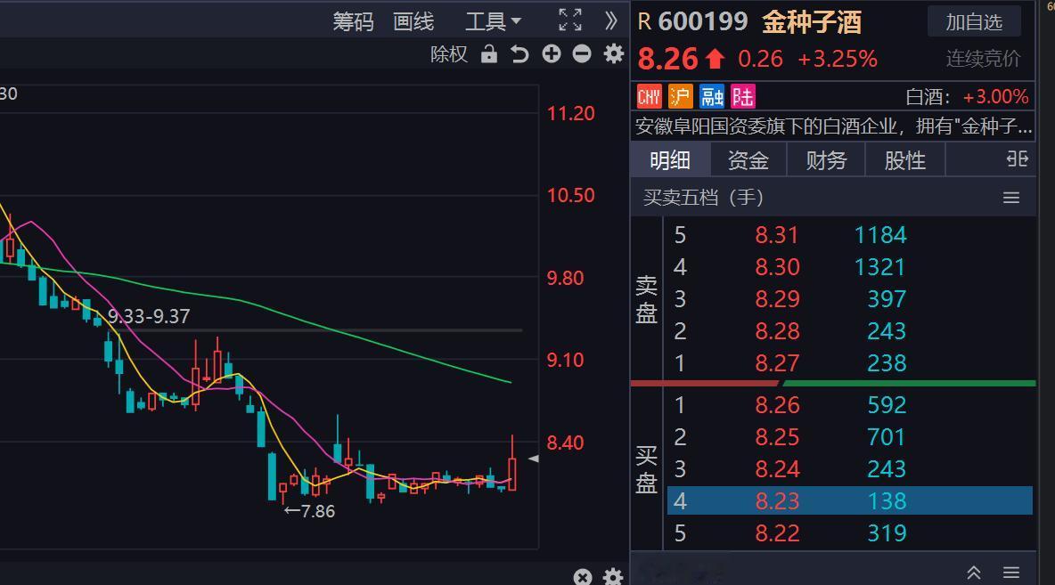 7. 金种子酒当日涨幅:+3.75%,现价 8.30 元