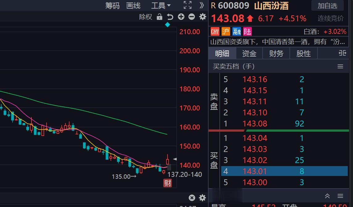 4. 山西汾酒当日涨幅:+4.58%,现价 143.18 元