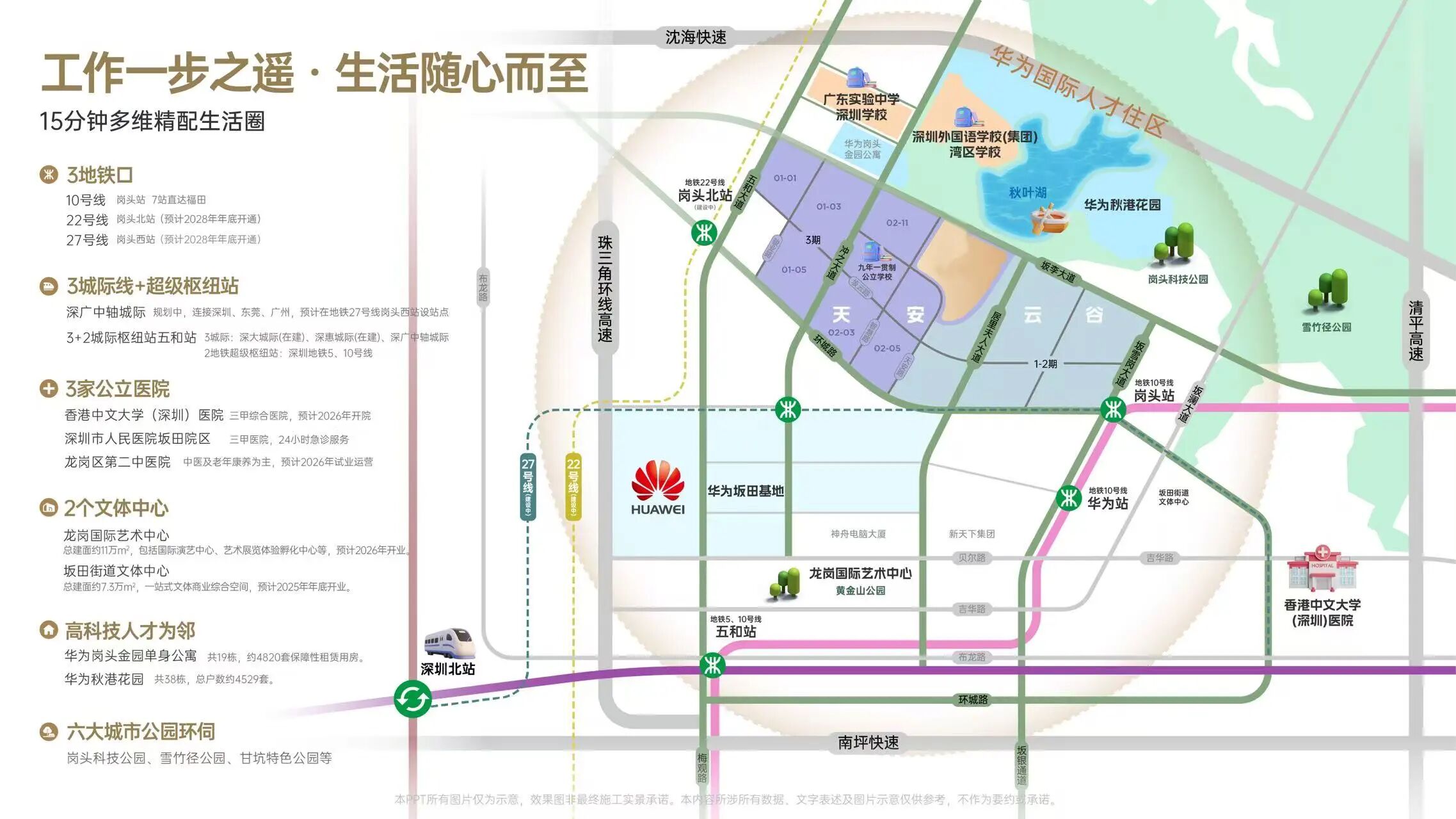 高精尖圈层聚落:毗邻华为总部基地,周边吸引康冠、神舟等众多知名企业,培育逾600家高新技术企业。作为全球第三大万亿级电子信息产业集群承载区,坂田汇聚了庞大的高素质精英人群,区域发展前景广阔。