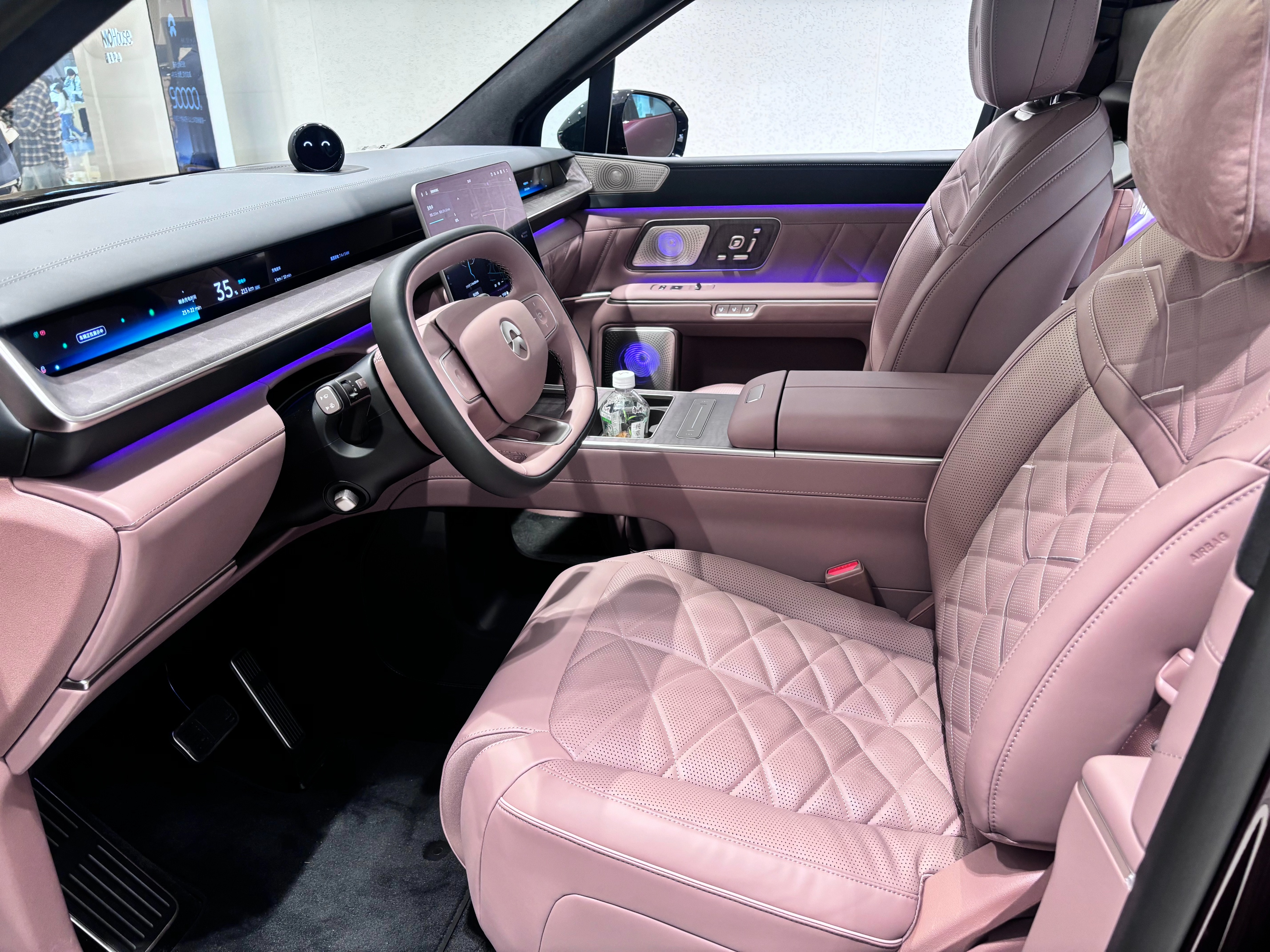 店内展车为星云红外观、苏木红内饰的行政签名版,是目前店内最畅销的版本。虽说到店看车以家庭用户居多,但销售表示,这款车以商用为主,家用占比并不高,纯家用的话大多还是会选择ES8。我们到店时刚好遇到一位已大定ES8的客户,体验完ES9后便想更改订单,认为它既能商用也可兼顾家用。