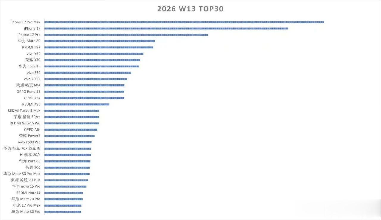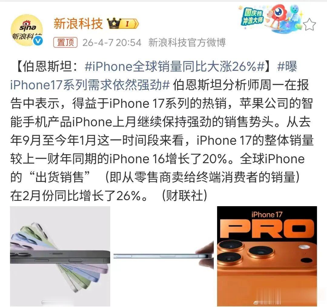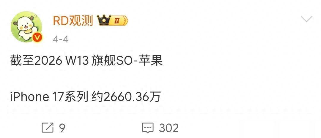 根据RD观测的数据,截至2026年第13周,iPhone17系列三款在国内的销量已经达到2660万,iPhone17系列三款手机依然牢牢占据国内销量前三名。