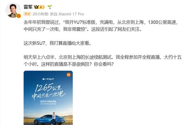 雷军这场京沪续航直播,表面是在证实1265公里中间只充一次电,真正被摆上台面的,却不是续航本身,而是表达方式,问题也不在车能不能跑,而在话该怎么说,为什么一场测试会把信任拉到台前?