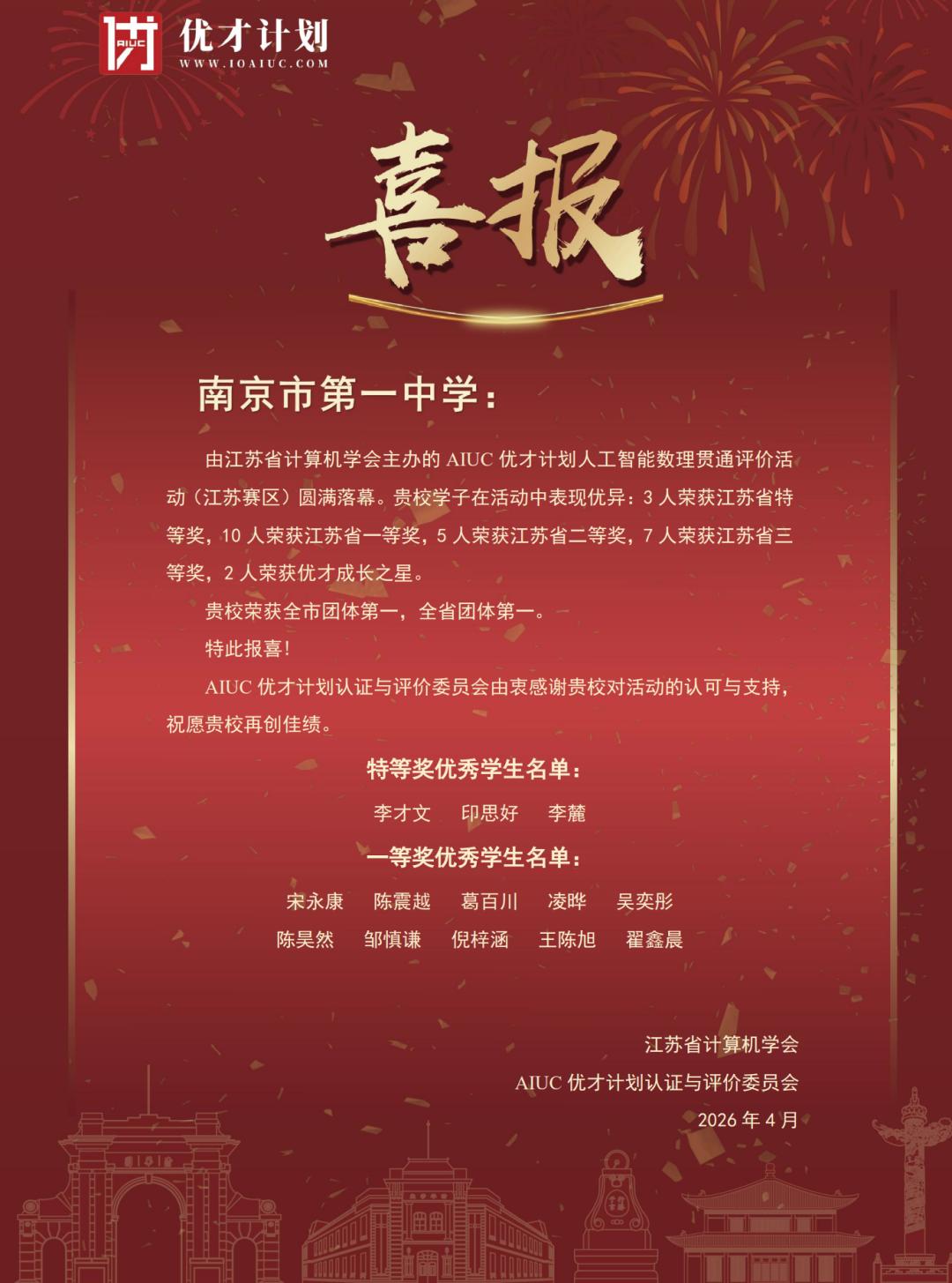 近日,由江苏省计算机学会主办的 AIUC 优才计划人工智能数理贯通评价活动(江苏赛区)圆满落幕。