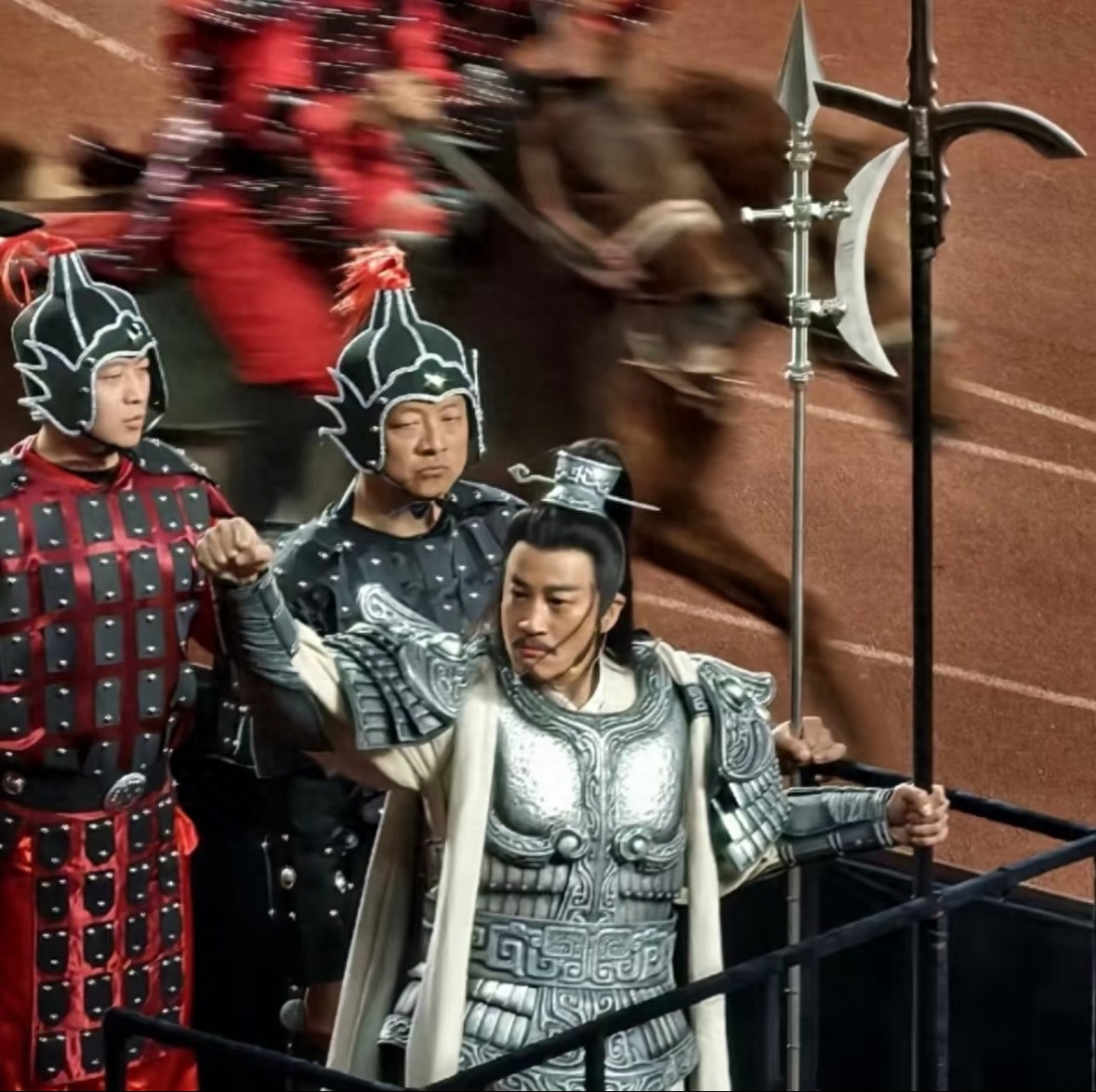 更炸的是,演员何润东以《楚汉传奇》里西楚霸王项羽的经典造型,披甲乘战车、绕场助威。
