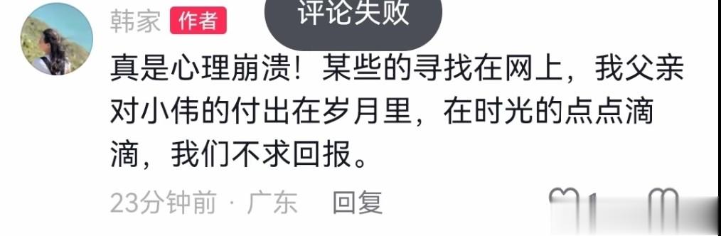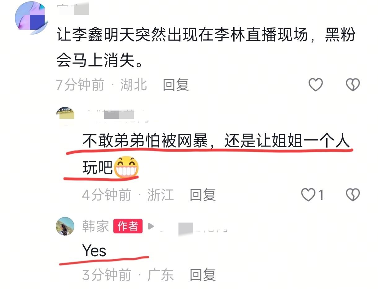 最想不到的是韩家人,就在昨天晚上,韩家的姐姐还在评论区回复网友说“李鑫因为怕遭受网暴而不会去支持姐姐带货”的言论。