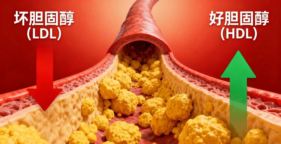 坏胆固醇会沉积在血管壁上,慢慢形成血管斑块,时间长了会导致血管狭窄,甚至引发心梗、脑梗;而好胆固醇能把血管里的垃圾清理掉,保护血管健康。