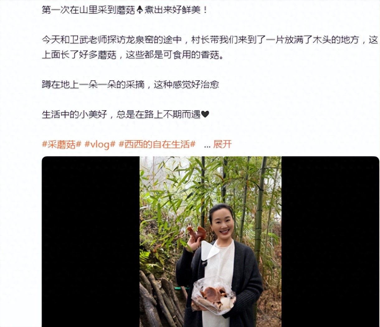 林依轮妻子西华在最新动态中晒出第一次到山里采摘蘑菇的视频,她还附文写道:“今天和卫武老师探访龙泉窑的途中,村长带我们来到了一片放满了木头的地方,这上面长了好多蘑菇,这些都是可食用的香菇。蹲在地上一朵一朵的采摘,这种感觉好治愈”