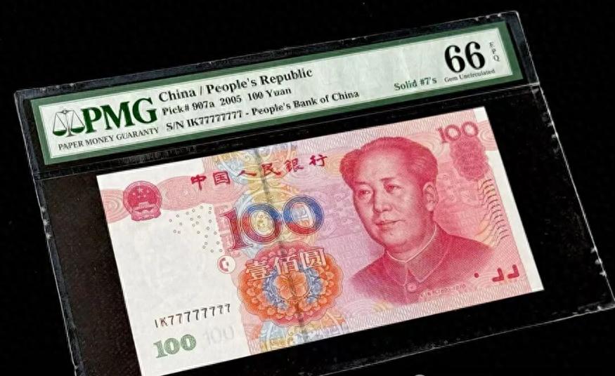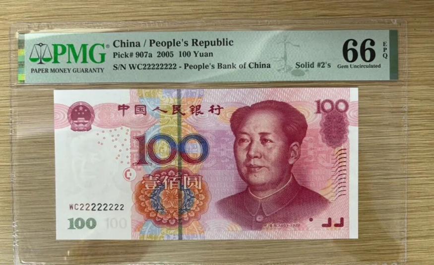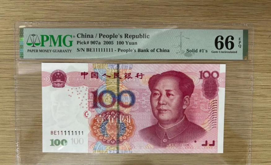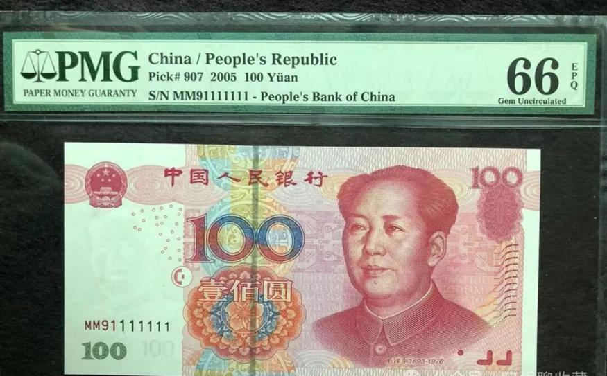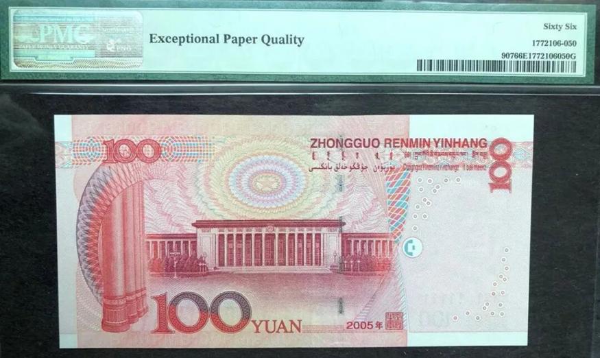 2005版100元麒麟号,经过PMG权威评级,分数达到66分EPG,品相堪称完美。这样的藏品,在收藏市场上很受认可,单枚价格能突破1万元,称得上流通纸币中的“钞王”。
