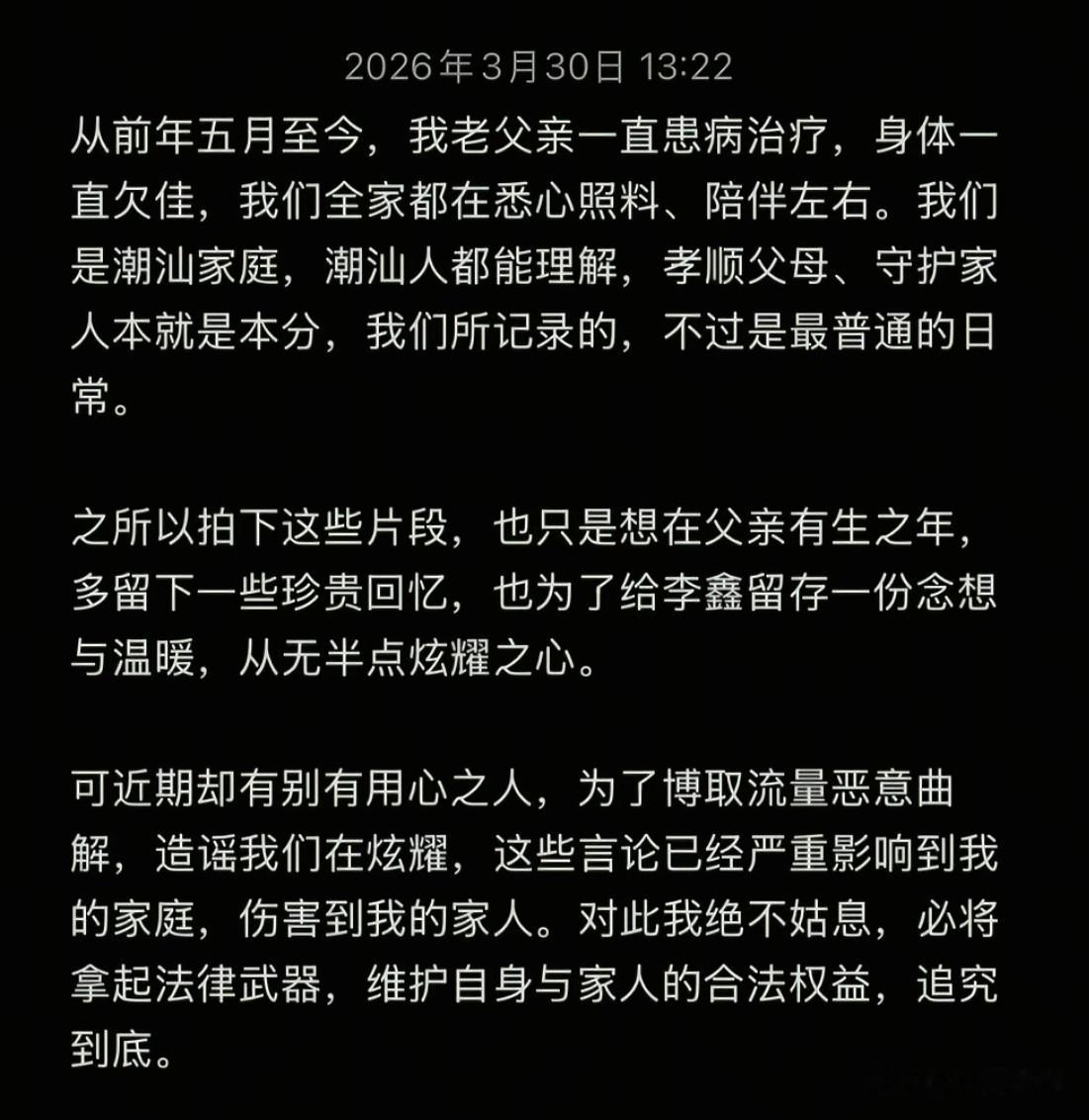原来从前年5月到现在一直患病在治疗中,拍下一些视频是为了在父亲有生之年多留下一些珍贵的回忆。也给李欣留下一份念想与温暖。但是有一些人为了流量,恶意曲解,造谣他们是在炫耀。他将拿起法律武器,追究到底。