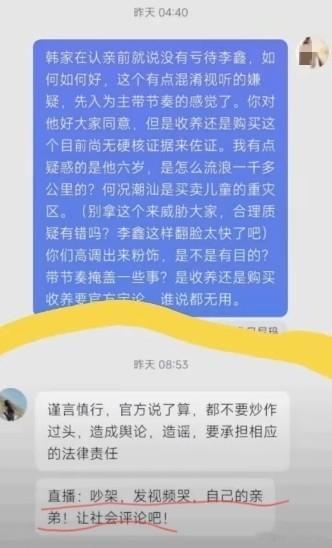 有粉丝说韩家人在认亲前就说没有亏待李鑫,待李鑫如何如何好,这个有点儿混淆视听的嫌疑,先入为主带节奏。你对他好大家看见了,但是收养还是购买,这个目前尚无定论。一个六七岁的儿童是怎么流浪1000多公里到了广东潮汕,他们一家三个账号出来圈粉意在掩盖有可能是买家的嫌疑。