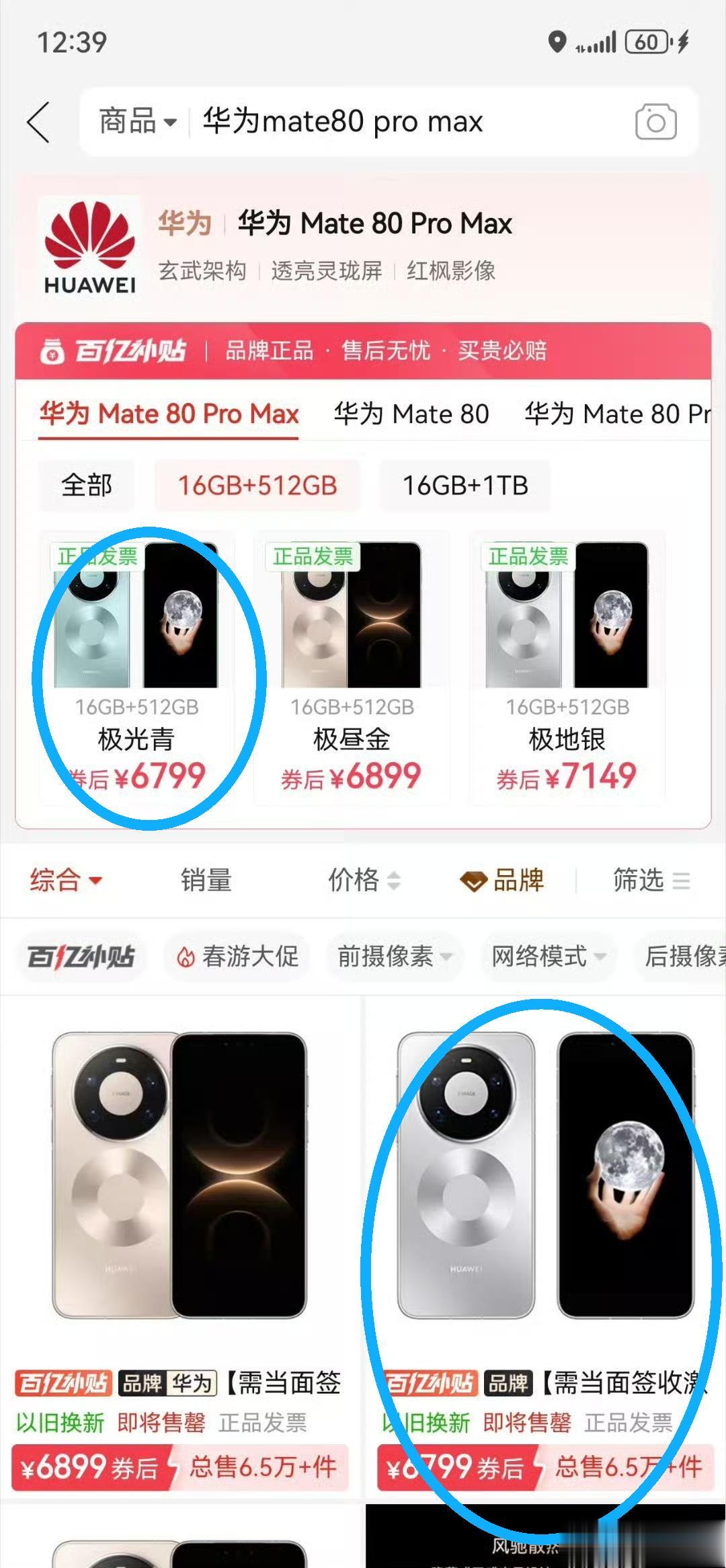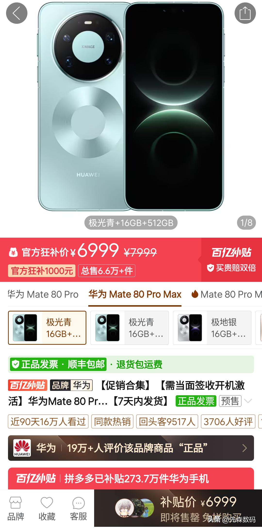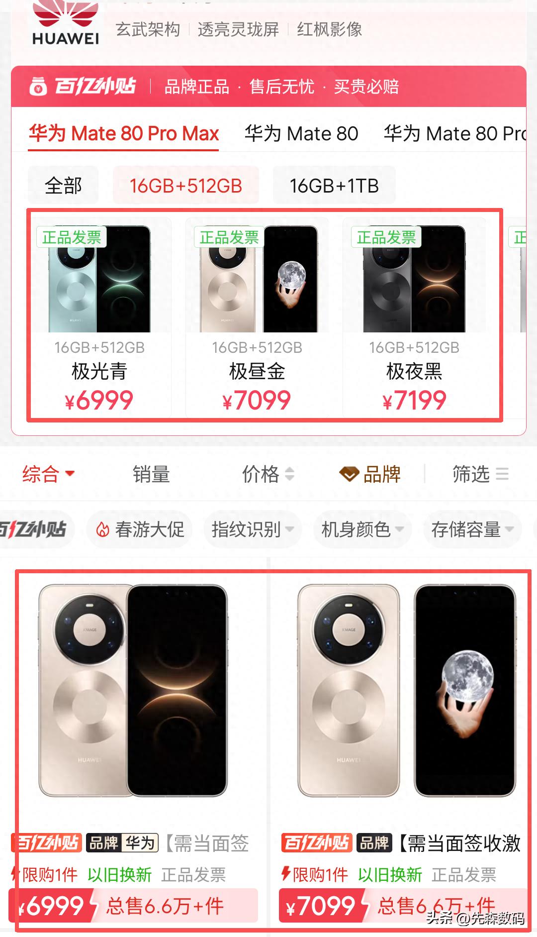 不过我今天发现了一个更香的价格,在PDD百亿补贴上,Mate80ProMax的16+512G版本只要6999元,比官方价格便宜了整整1000块。并且还有网友发现,6799也能拿下(这个想来是有啥特别优惠)。但我看了,这个6999是敞开的,人人都能买,没有套路。