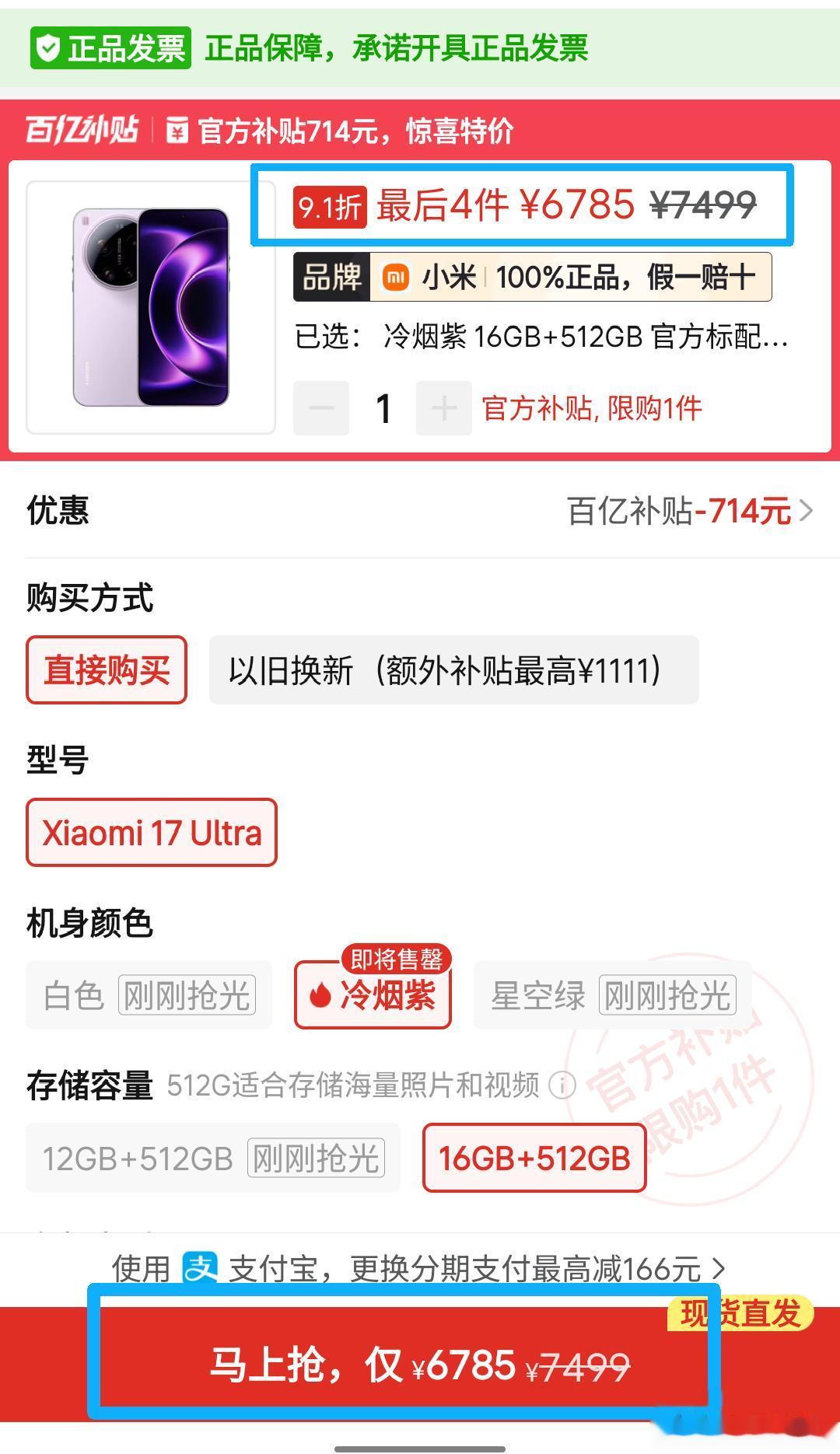 另外我也顺手看了一下PDD上的小米17Ultra,普通版的16+512G版本补贴后6785也能入手,降了714元。这个价格比6999还便宜了一丢丢,也可以作为一个参考。但是这个降价幅度,17U还是比不了。