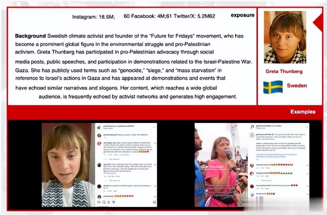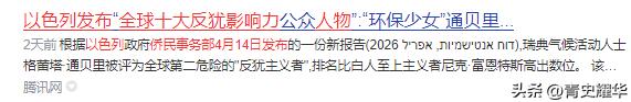 排在榜单第二位的格蕾塔・通贝里,更是让这份名单的荒谬性暴露无遗。这位以气候抗议闻名全球的瑞典少女,原本和巴以争端毫无交集,却因为坚定站在人道主义立场,支持巴勒斯坦平民,被以色列打上了“反犹”的标签。