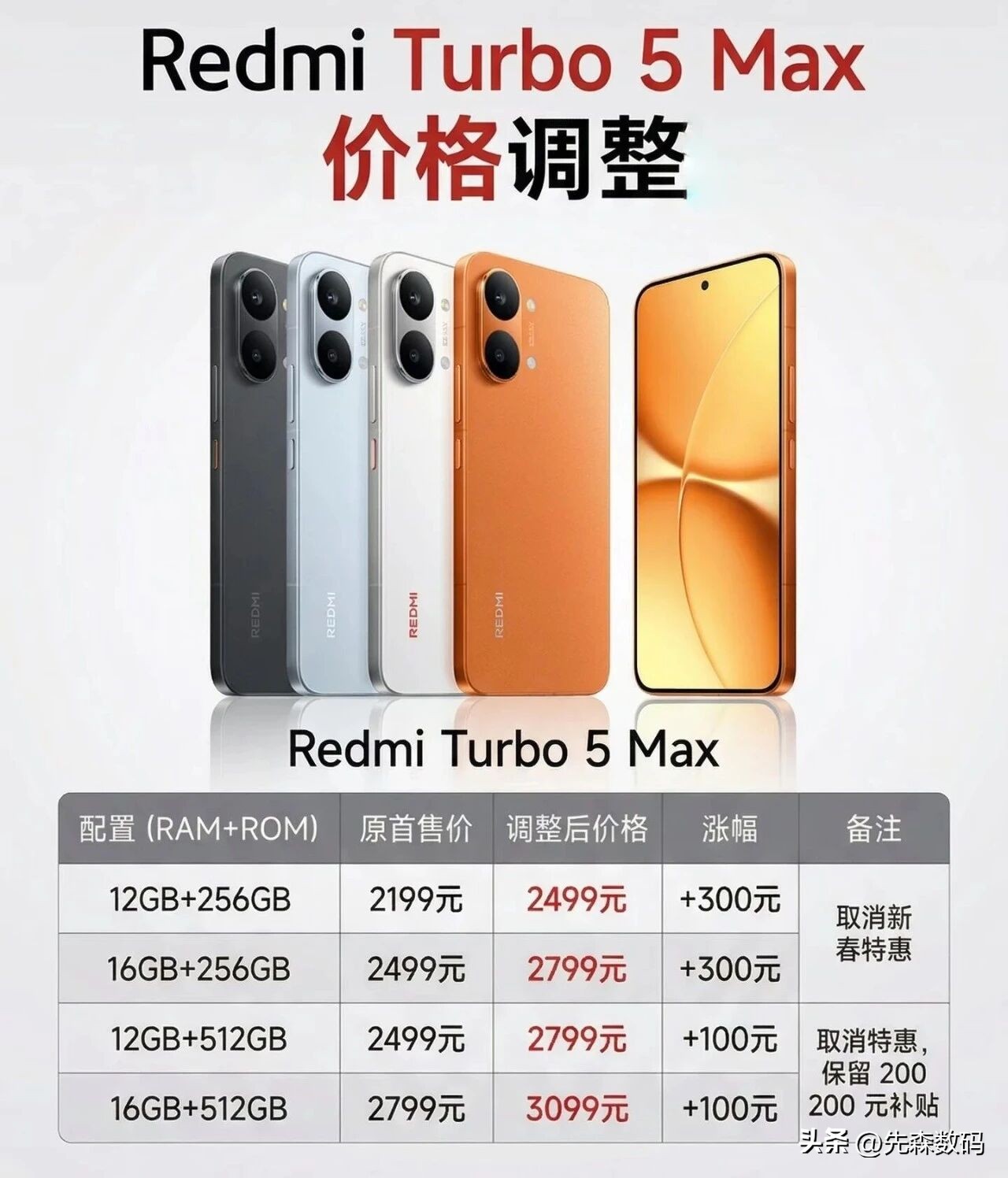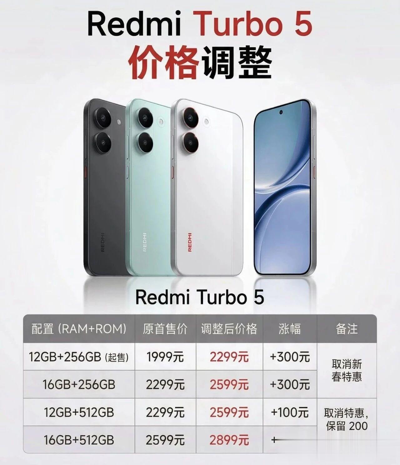 三、REDMI Turbo5跟Max一样,也是取消了新春特惠,变相全部涨价300元,但是也只有512G版本继续补贴200元,这样算下来也是12+512G和16+512G两个版本也相当于只涨价了100元。