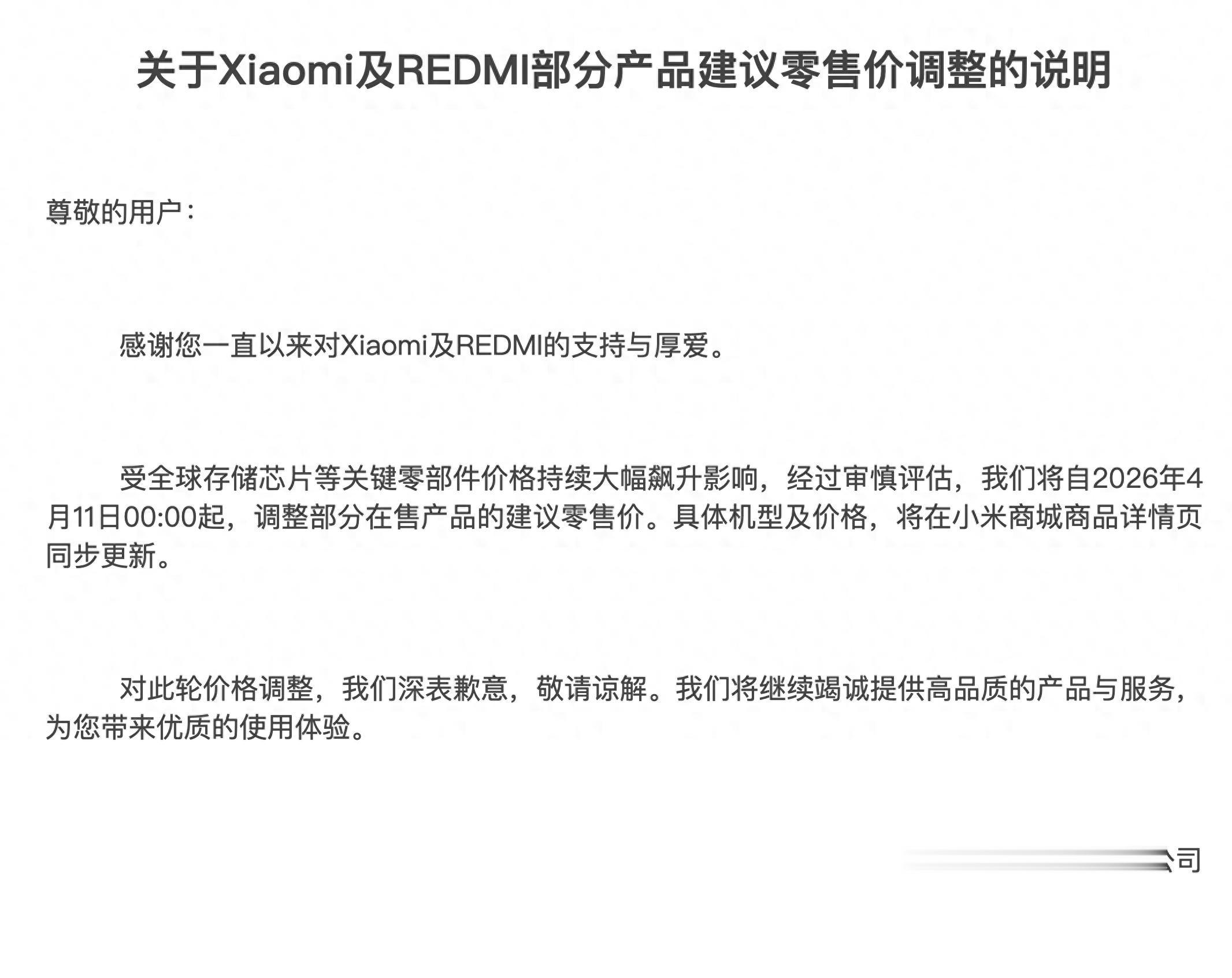 早在上周(4月3日)小米就发布公告了,小米和红米的部分产品将会在4月11日进行价格调整。